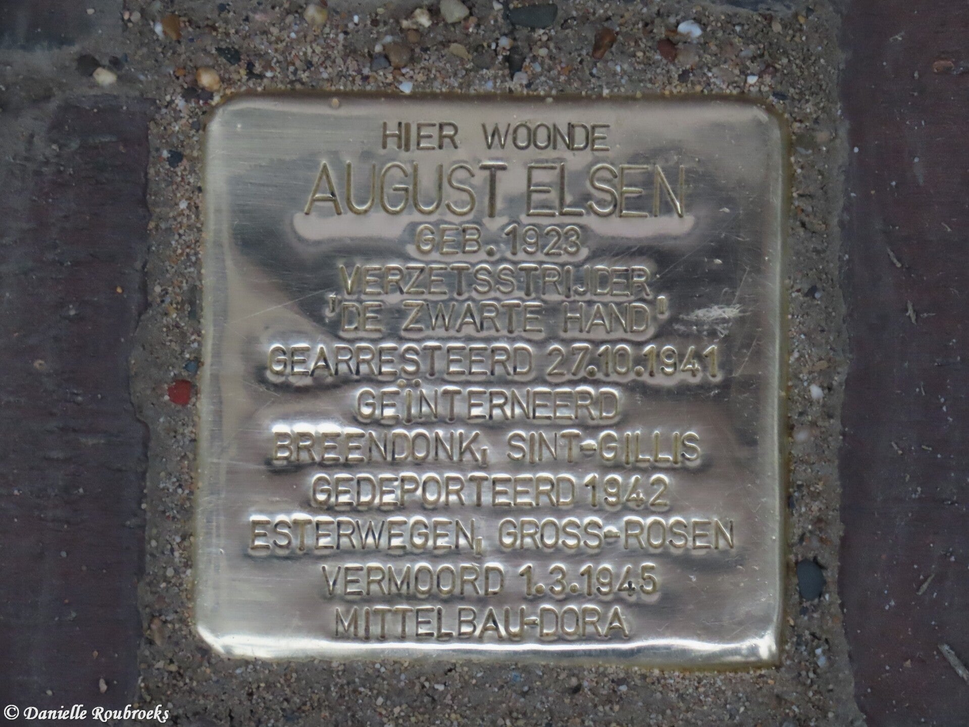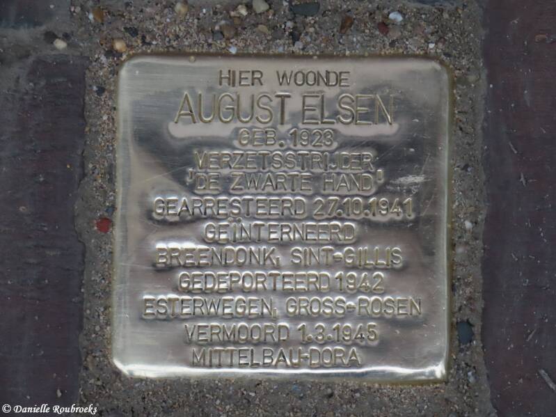 August Elsen was born on 8 July 1923 in Boom. During the Second World War August had joined the resistance movement "De Zwarte Hand" and was arrested for his resistance activities on 27 October 1941. After his arrest he was first locked up in Fort Breendonk and transferred the same day to the prison of Sint-Gillis. On 25 June 1942 he was deported to Wuppertal. From there to Esterwegen and on 30 October 1944 he arrived at the KZ Gross-Rosen where he had to perform forced labour until the camp was evacuated on 8 February 1945. The exact date of death is unknown, but it is known that he probably died in April 1945 in the Boelcke Barracks in Nordhausen.