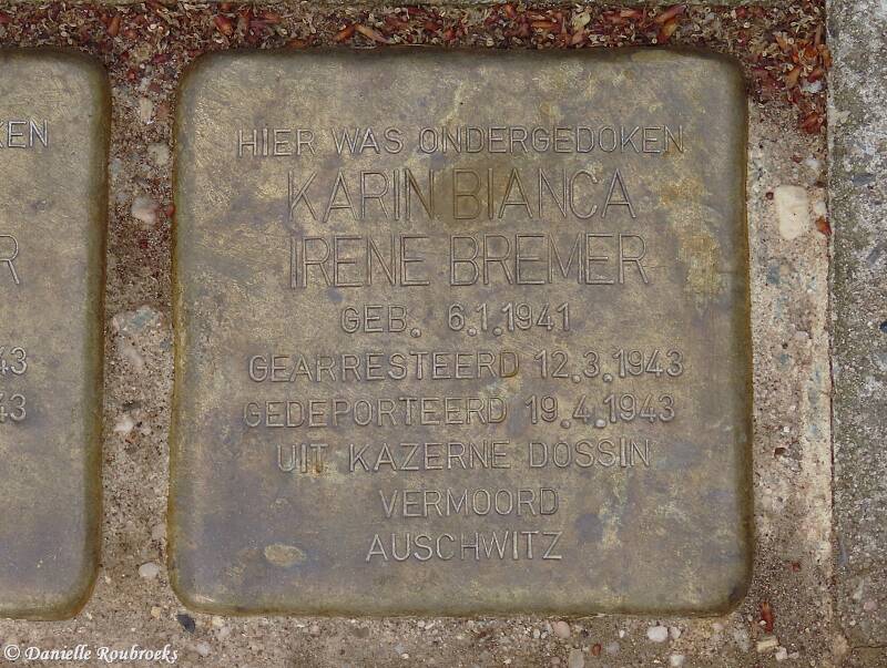 Thanks to the network of Klaas and Julia Sluys-Schuyten, Reformed Protestants from Boechout, Sophia and Karin were able to go into hiding in October/November 1942 with Charles and Yvonne Hendrickx-Noë at Lentelei 35 in Edegem. On March 11, 1943, the Sicherheitspolizei-SD (SiPo-SD) raided the Hendrickx family's home. Sophia Bremer was arrested on the spot. Charles and Yvonne claimed that two-year-old Karin Bremer was their child, but the following day Karin was taken away anyway. Mother and daughter were transferred to the prison in Antwerp on March 12 and a week later to the Dossin Barracks in Mechelen. On April 19, Sophia and Karin were deported to Auschwitz on transport XX and murdered upon arrival.