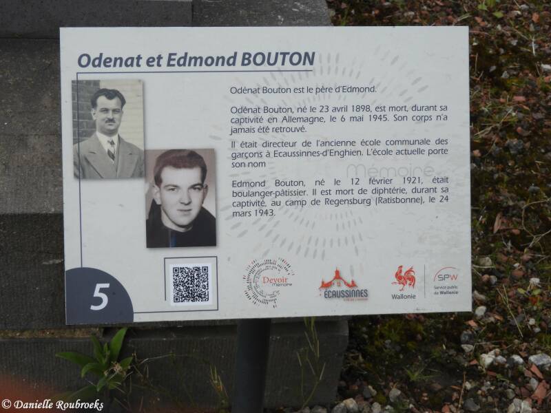 Odénat Bouton is Edmond's father. Odénat Bouton, born April 23, 1898, died during his captivity in Germany on May 6, 1945. His body has never been found. He was the director of the former municipal boys' school in Ecaussinnes-d'Enghien. The current school bears his name Edmond Bouton, born February 12, 1921, was a baker. He died of diphtheria during his captivity at the Regensburg camp (Regensburg) on March 24, 1943.