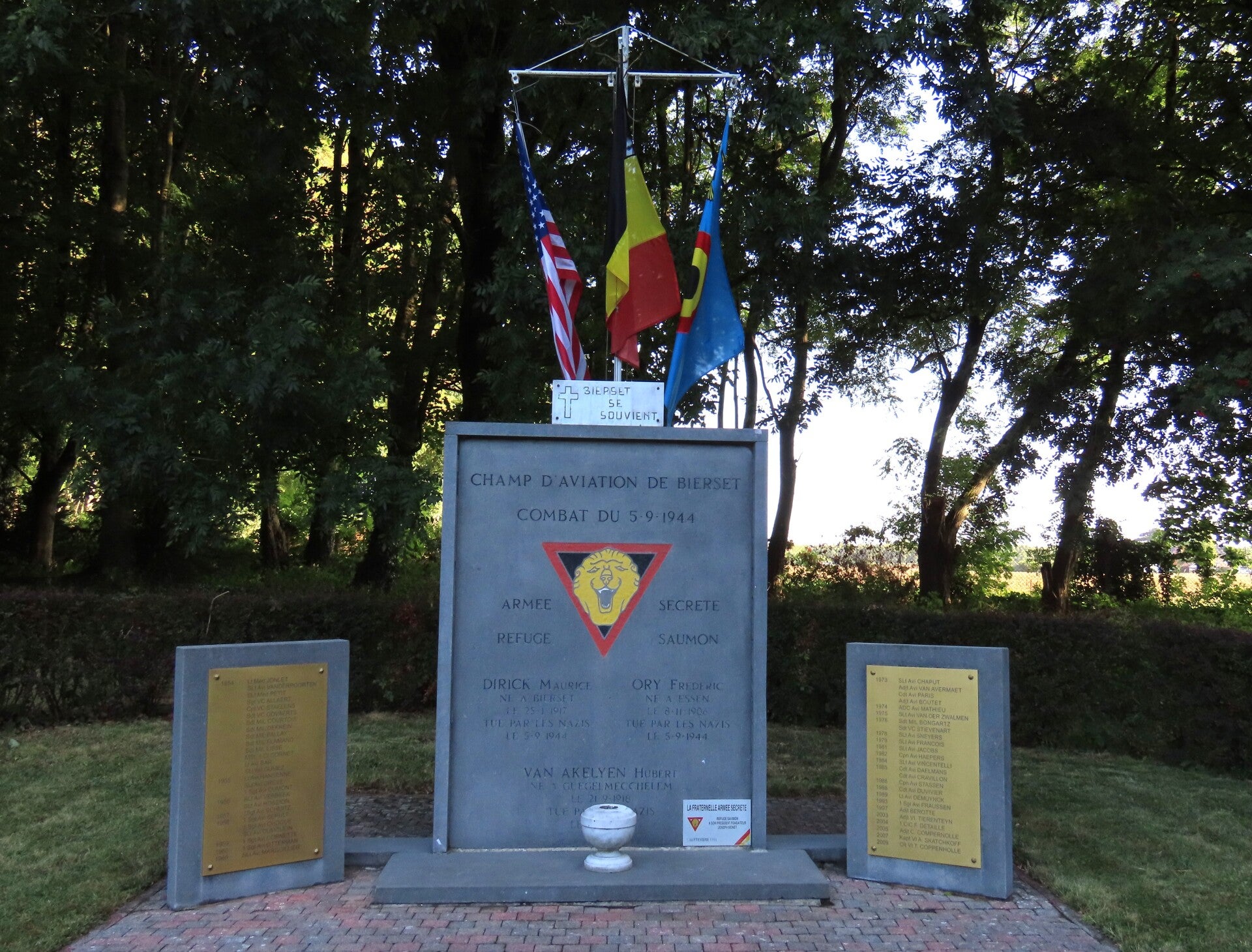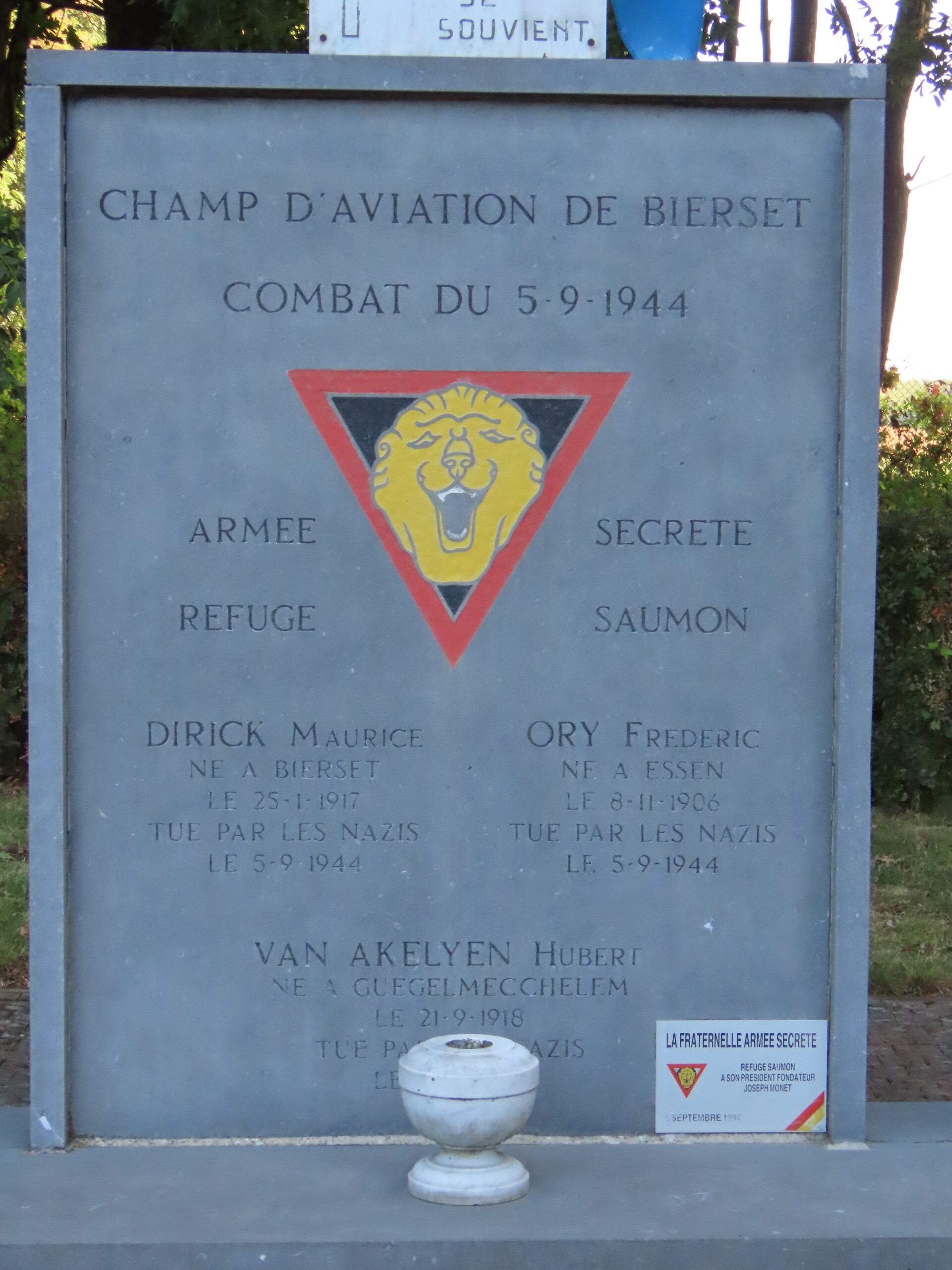 Monument in memory of the resistance fighters of the "Refuge Saumon" in Bierset, at the The Fraternelle "The White Bison" in Bierset.