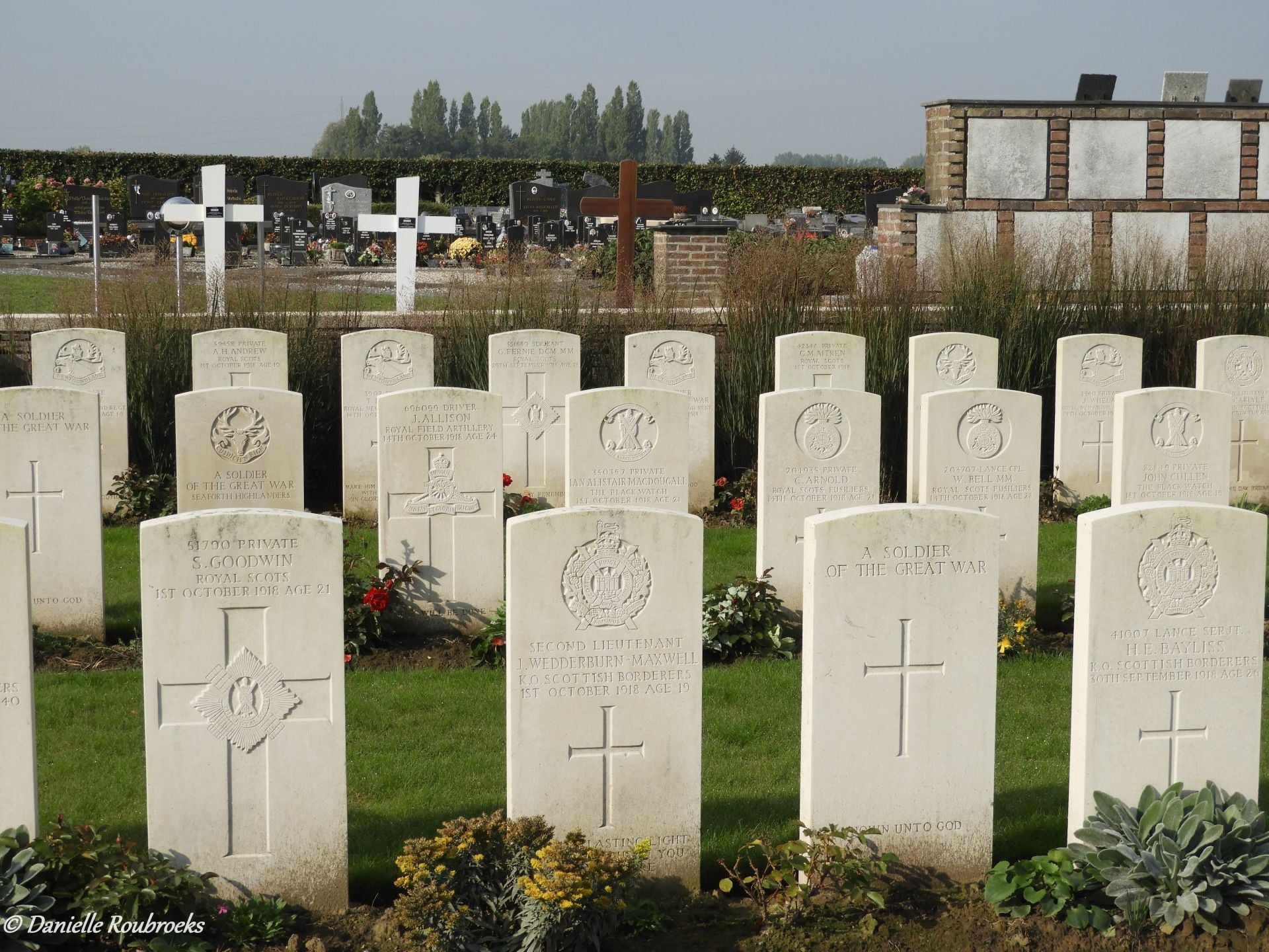The village of Dadizeele (now Dadizele) was in German hands for much of the First World War until reached by the 36th (Ulster) Division, and taken by the 9th (Scottish) Division, on 29 September 1918. Severe fighting followed on 1 October, at Hill 41, a little south of the village. Dadizeele New British Cemetery is in fact an extension of the communal cemetery. It was made after the Armistice when graves were brought in from other burial grounds and from the battlefields of 1918, although there are a few 1914 graves in Plot VI, Row D.
