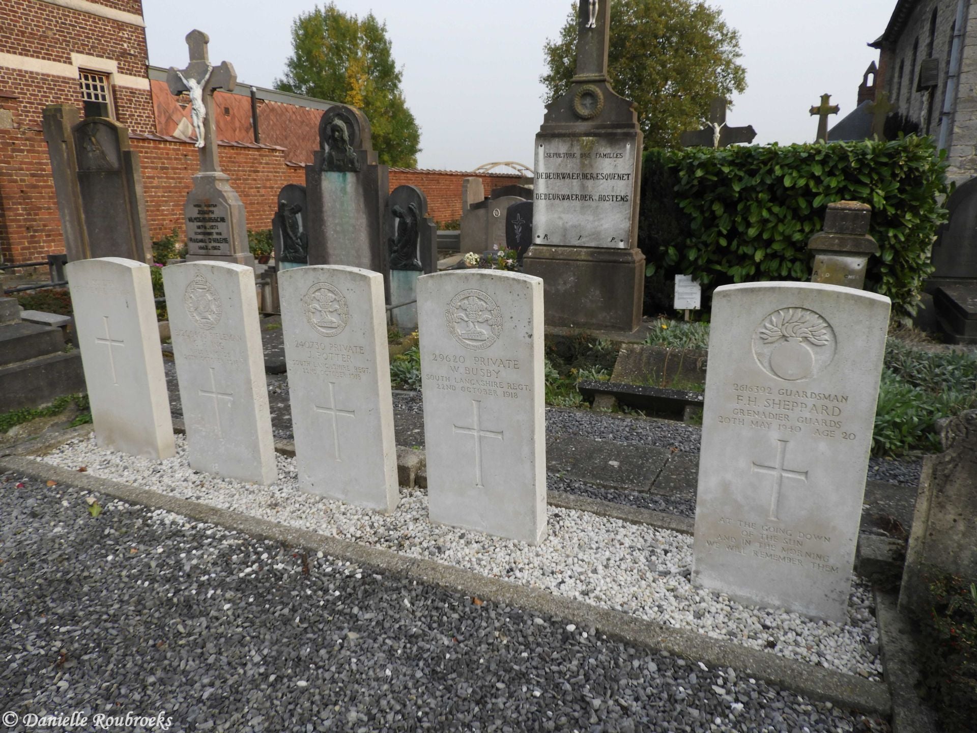 These graves were brought in after the Armistice from a point between Helkijn Church and the sugar factory. The single burial of the Second World War dates from May 1940 and the withdrawal to Dunkirk ahead of the German advance.