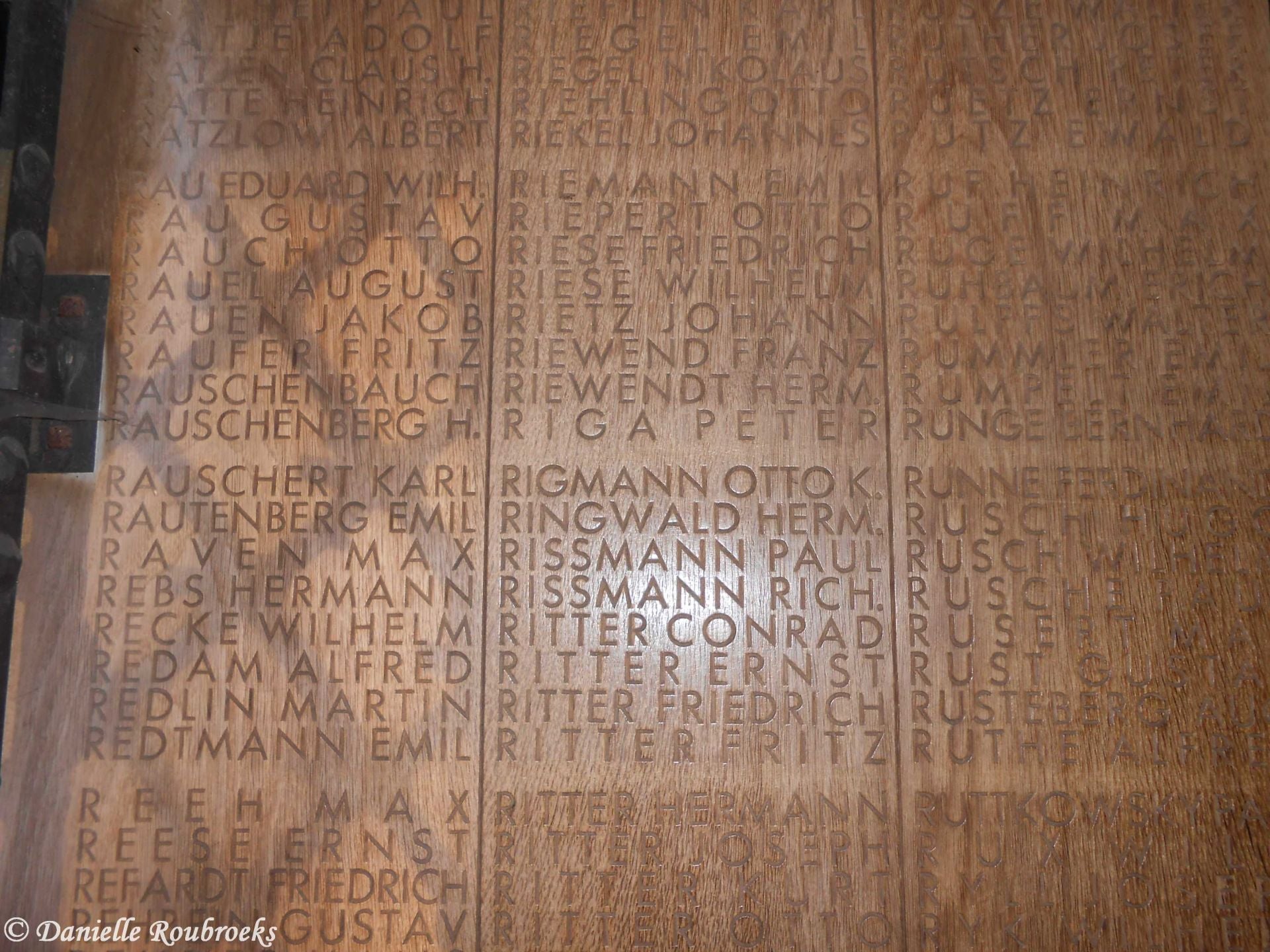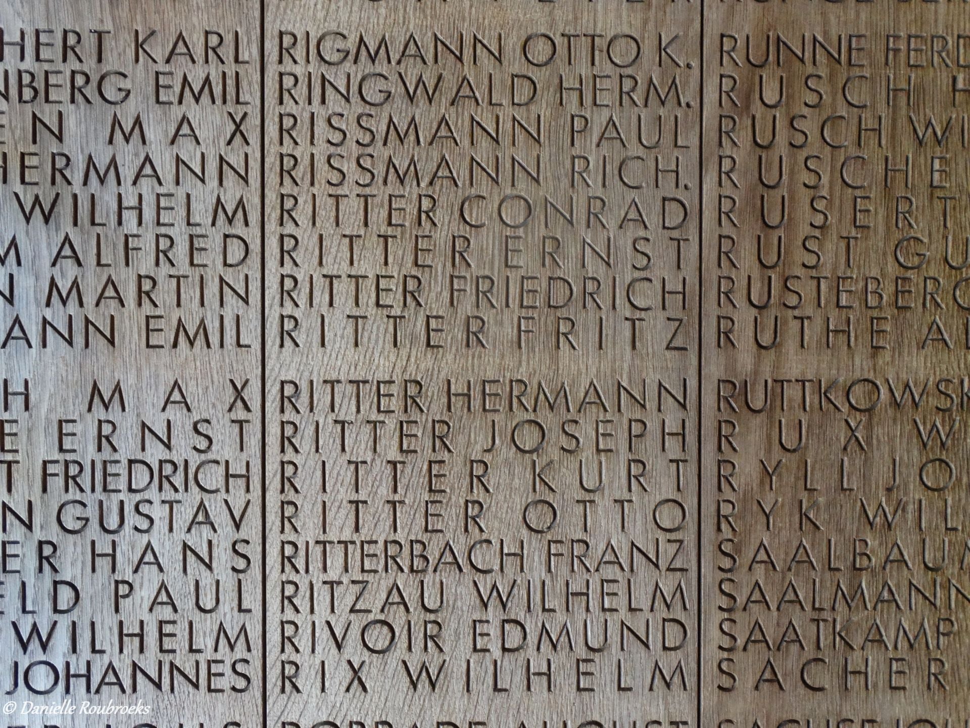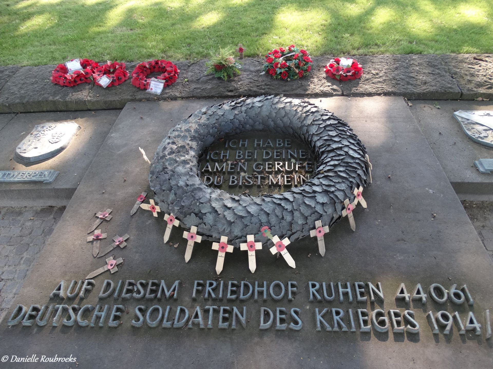 The coats of arms of 8 Belgian provinces lie in front of the grave (East and West Flanders were given the name of Flanders; Brabant was divided into Flemish and Walloon Brabant). In the centre, between the 8 coats of arms, there is a bronze wreath of oak leaves with the words "Ich habe dich bei deinem namen gerufen, du bisst mein" (I have called your name, you are mine) Isaiah (43.1). Around the mass grave, there are blocks with 68 bronze panels bearing the names of 17,342 non-identified soldiers who, based on archive research done, were almost certainly buried in this mass grave. The names are in alphabetical order, starting at panel 1 (left of the mass grave), then clockwise along the inside of the blocks up to panel 34, and then they continue anti-clockwise from the back of the panel along the outside.