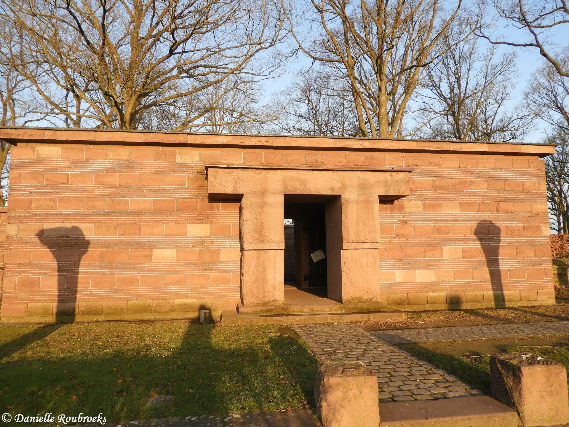 At the entrance there is a heavy building reminding one of a bunker. It was erected in red Weser/Vesder sandstone and was meant to make the transition from everyday life to the cemetery itself and in that way create some distance. There are three rooms in the entrance building: the central passage and two side rooms. On the oak panels of the "room of honour" to the right, are inscribed the known names of 6,313 soldiers killed in battle who were buried in the original (lower part of the) cemetery.