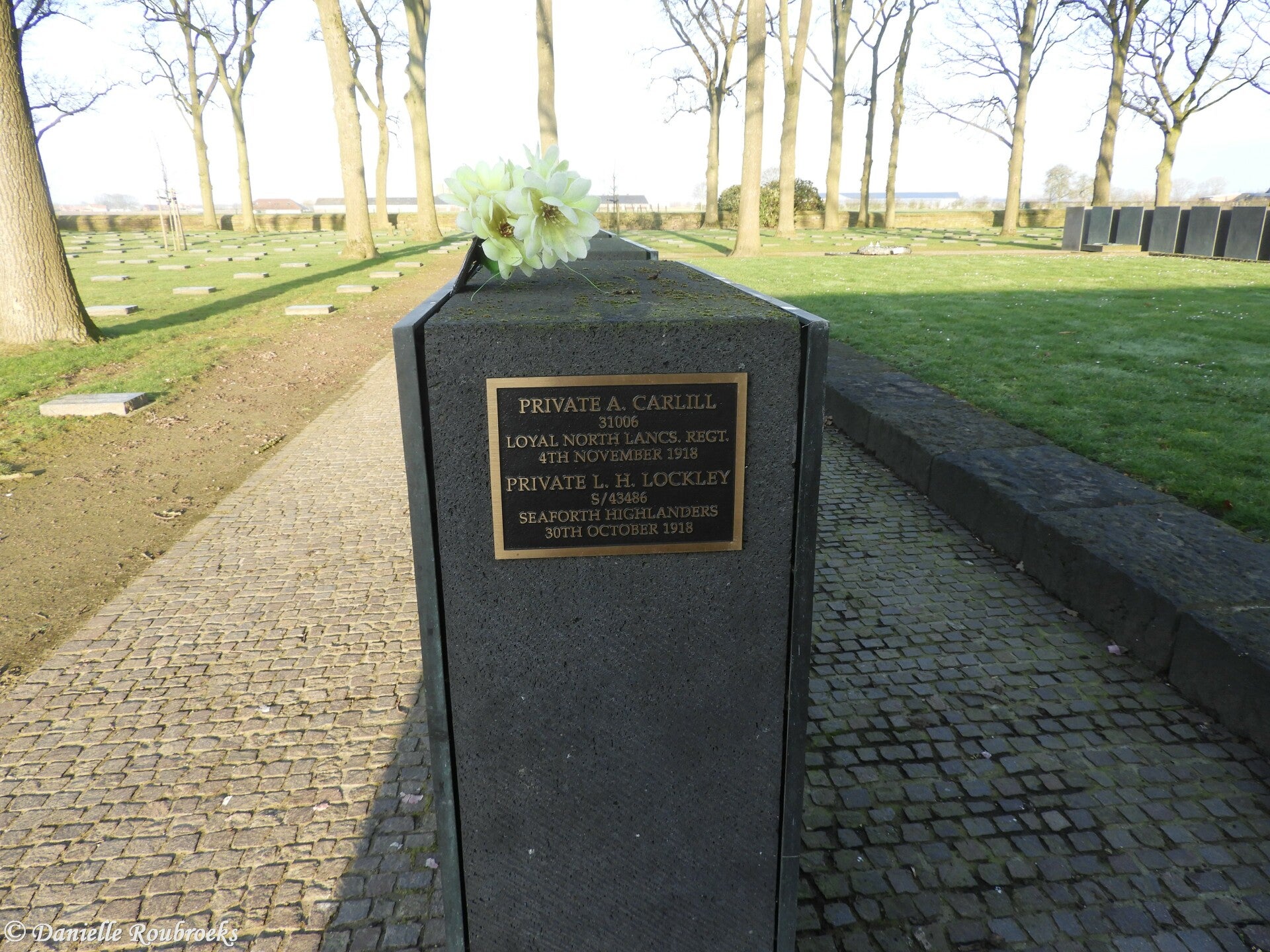 The names of the two British casualties can be found on a plaque to the left of the entrance, on the face of the first German memorial stone.