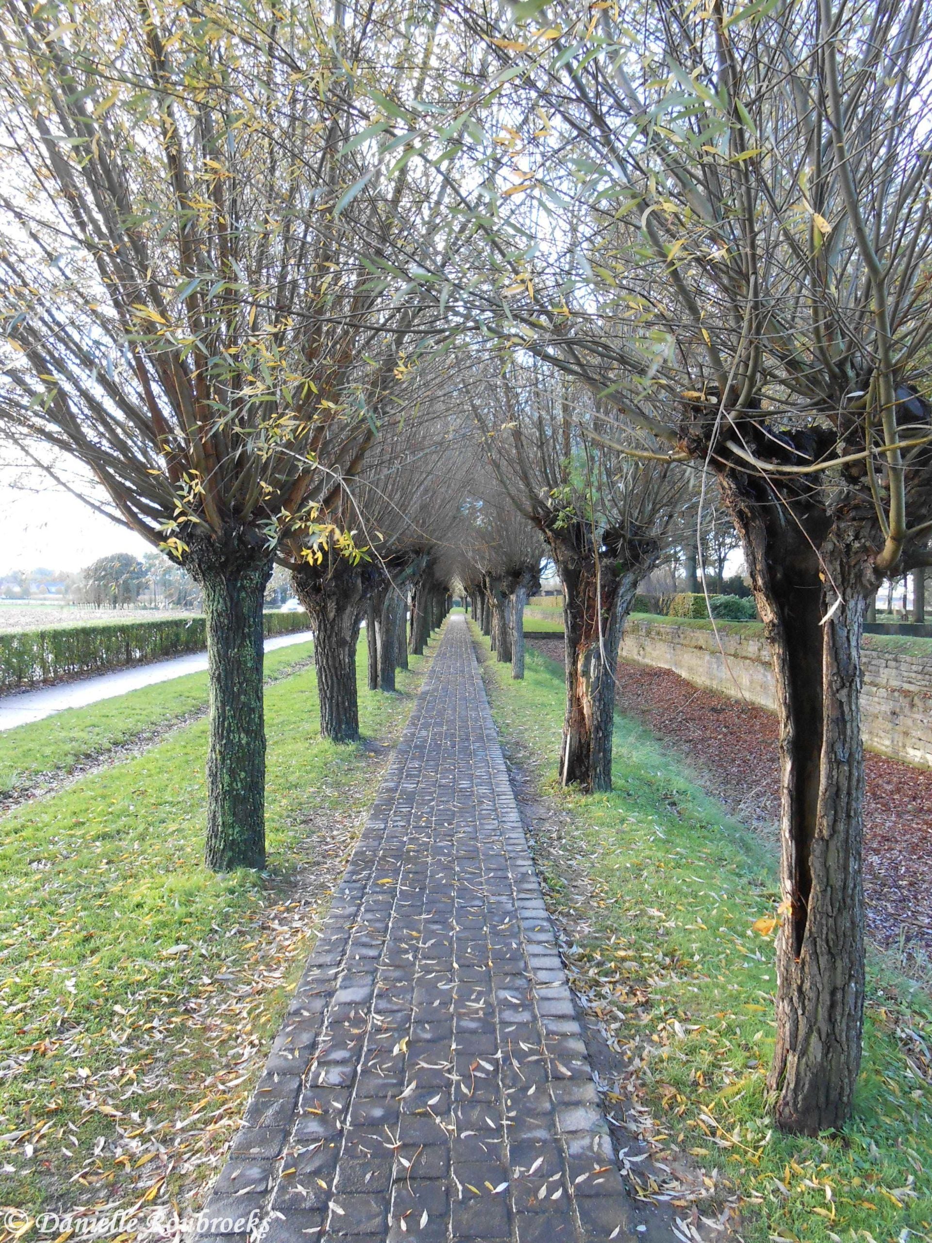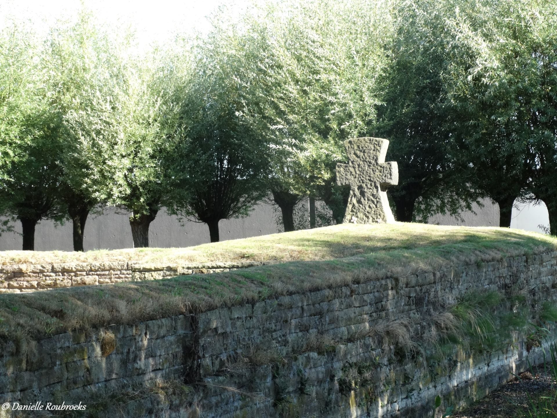 Fencing the cemetery, there is a low wide wall made of the same stone as the entrance building. Pollard willows grow on street side (as a guard of honour) and the right part of the former poppy field is surrounded by a wide ditch symbolising the flooding of the Yser front.