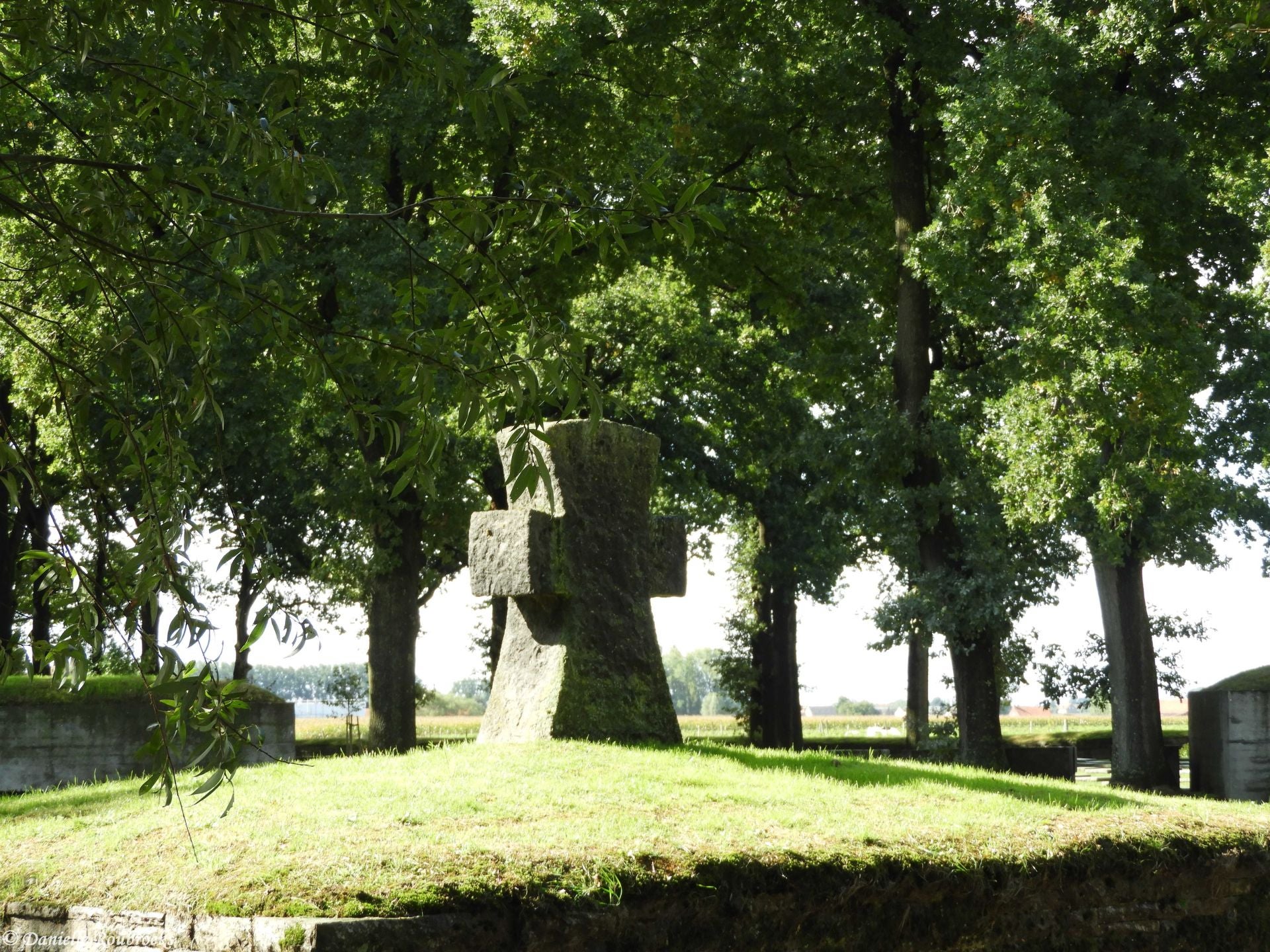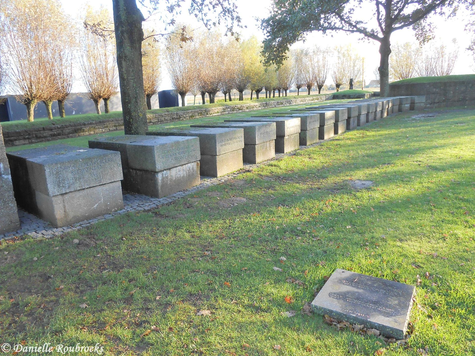On the higher part of the cemetery, there are three restored German concrete shelters, partly above-ground, with the entrances directed towards the German line (north). To emphasise this defence line (Hindenburg line Langemark-Geluveld) even more, the bunkers were linked to large concrete blocks with, in front, a granite block bearing the names of the army divisions and student organisations which had helped to lay out the original cemetery in the 1930s.