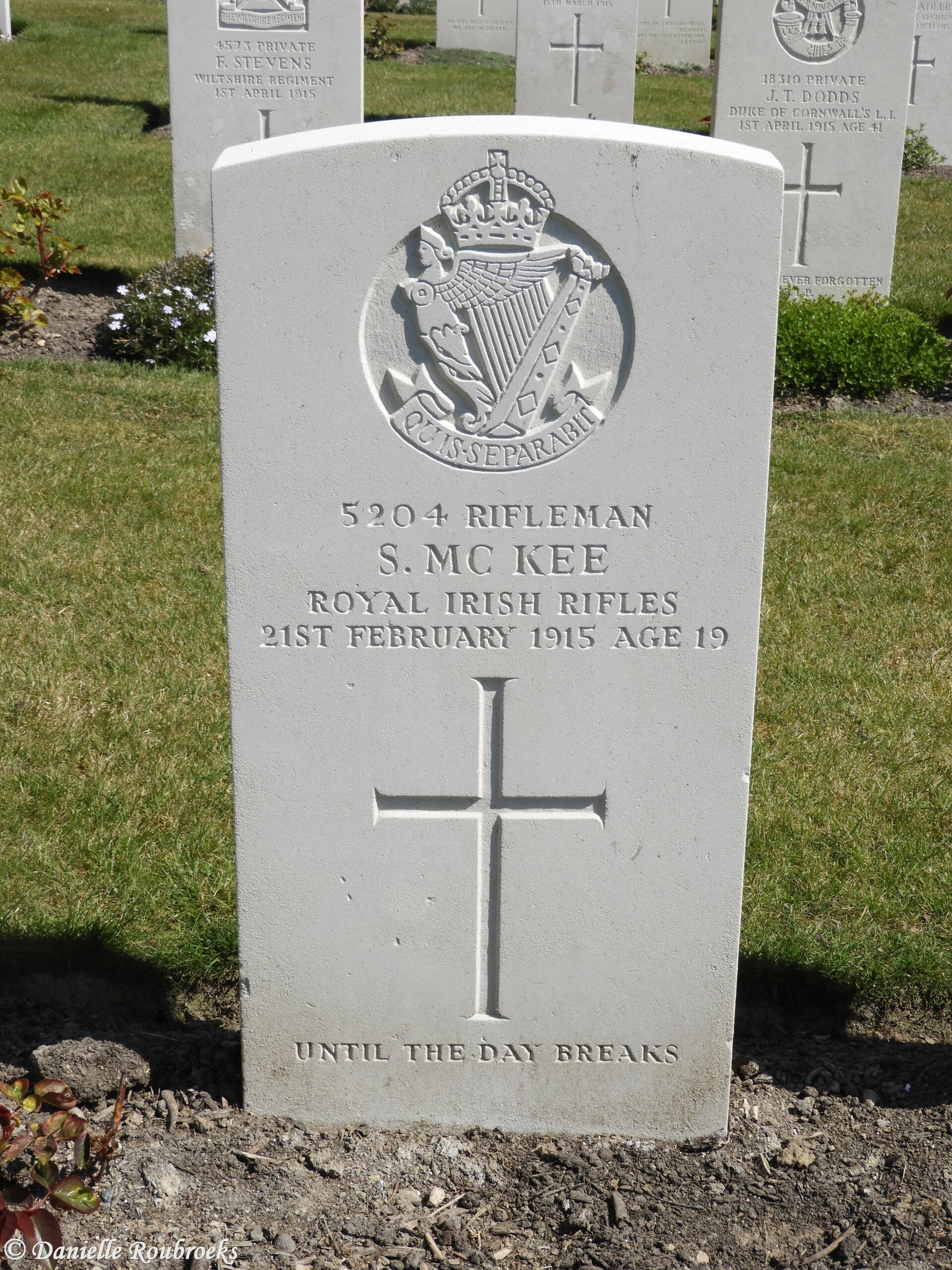 Locre (now Loker) was in Allied hands during the greater part of the war, and field ambulances were stationed in the Convent of St. Antoine. The village changed hands several times between 25 and 30 April 1918, when it was recaptured by the French. The hospice, or convent, was the scene of severe fighting on 20 May, but was not retaken until first week in July. Loker Churchyard was used by field ambulances and fighting units from December 1914 to June 1917, and it contains two Commonwealth plots. One grave was brought in after the Armistice from LOCRE FRENCH CEMETERY No.4.