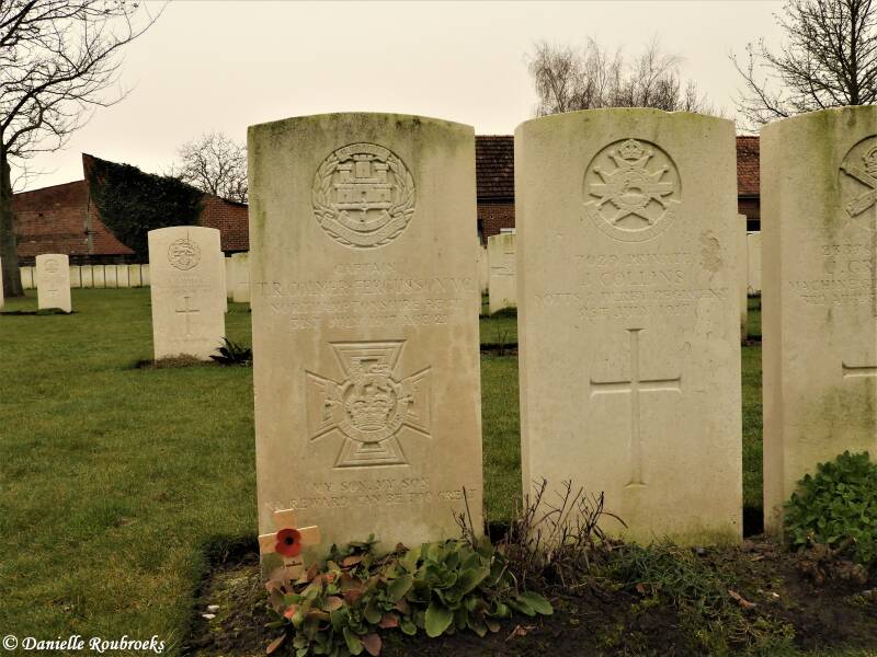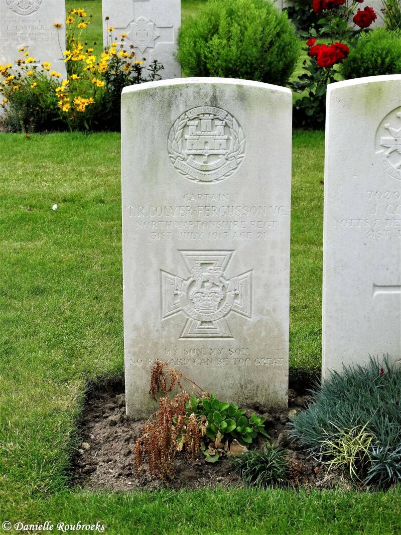 An extract from "The London Gazette," No. 30272, dated 4th Sept., 1917; records the following:- "For most conspicuous bravery, skilful leading and determination in attack. The tactical situation having developed contrary to expectation, it was not possible for his company to adhere to the original plan of deployments, and owing to the difficulties of the ground and to enemy wire, Captain Colyer Fergusson found himself with a Serjeant and five men only. He carried out the attack nevertheless, and succeeded in capturing the enemy trench and disposing of the garrison. His party was then threatened by a heavy counter-attack from the left front, but this attack he successfully resisted. During this operation, assisted by his Orderly only, he attacked and captured an enemy machine gun and turned it on the assailants, many of whom were killed and a large number driven into the hands of an adjoining British unit. Later, assisted only by his Serjeant, he again attacked and captured a second enemy machine gun, by which time he had been joined by other portions of his company, and was enabled to consolidate his position. The conduct of this officer throughout forms an amazing record of dash, gallantry and skill, for which no reward can be too great, having regard to the importance of the position won. This gallant officer was shortly afterwards killed by a sniper."