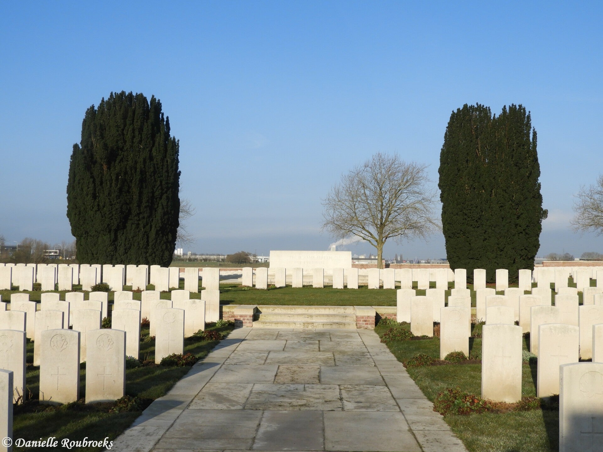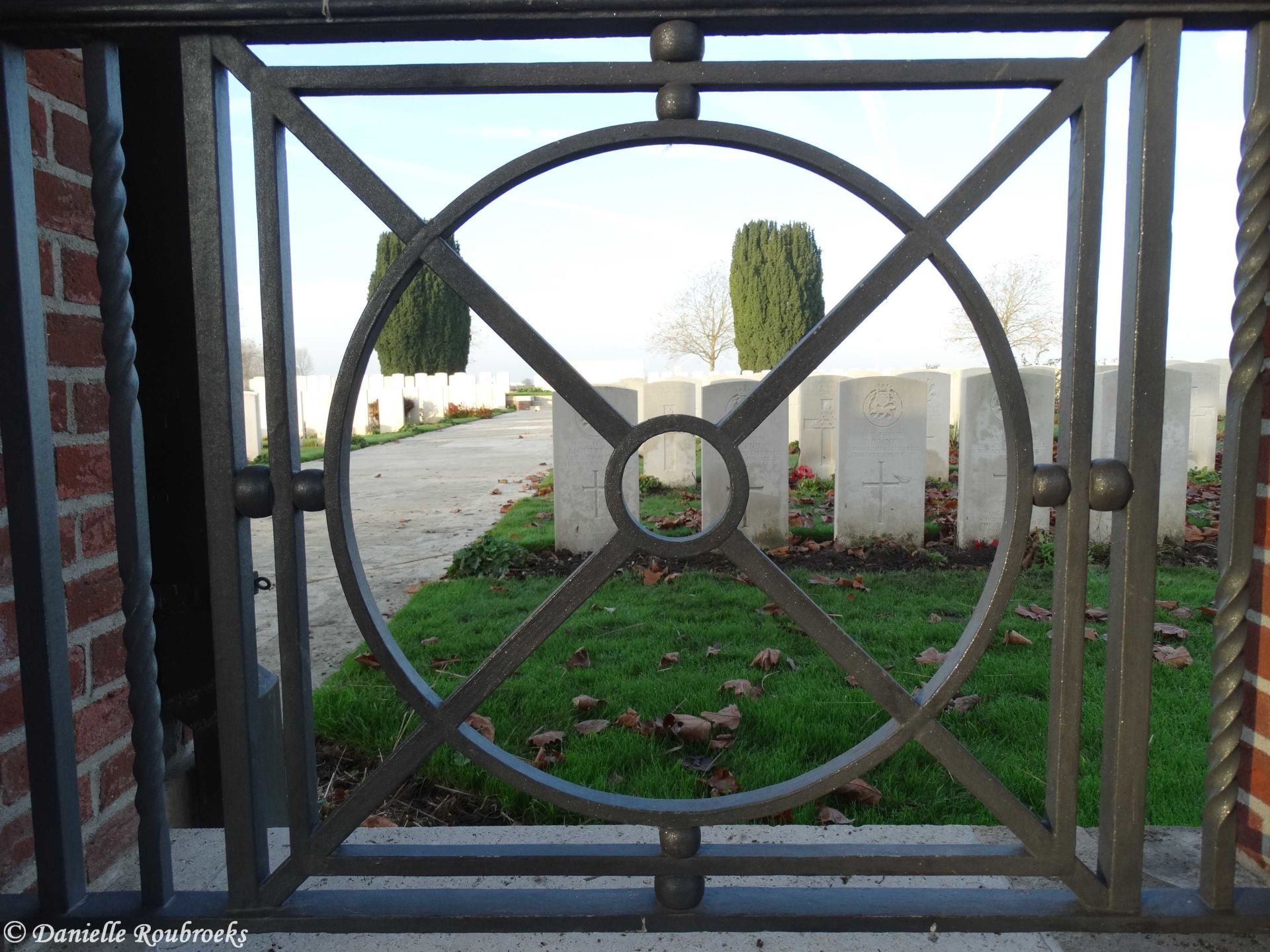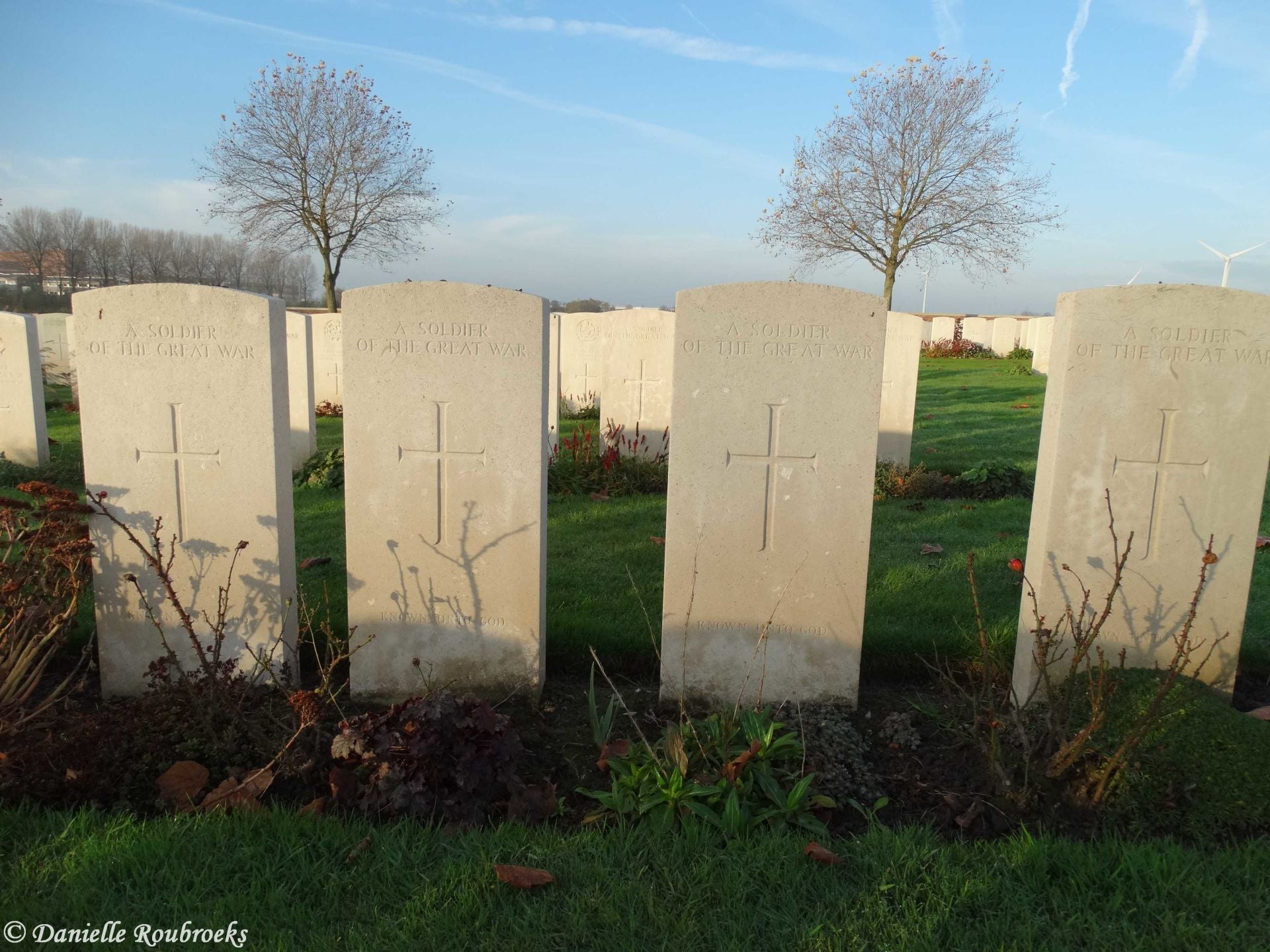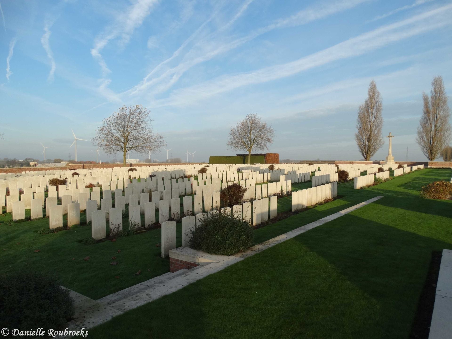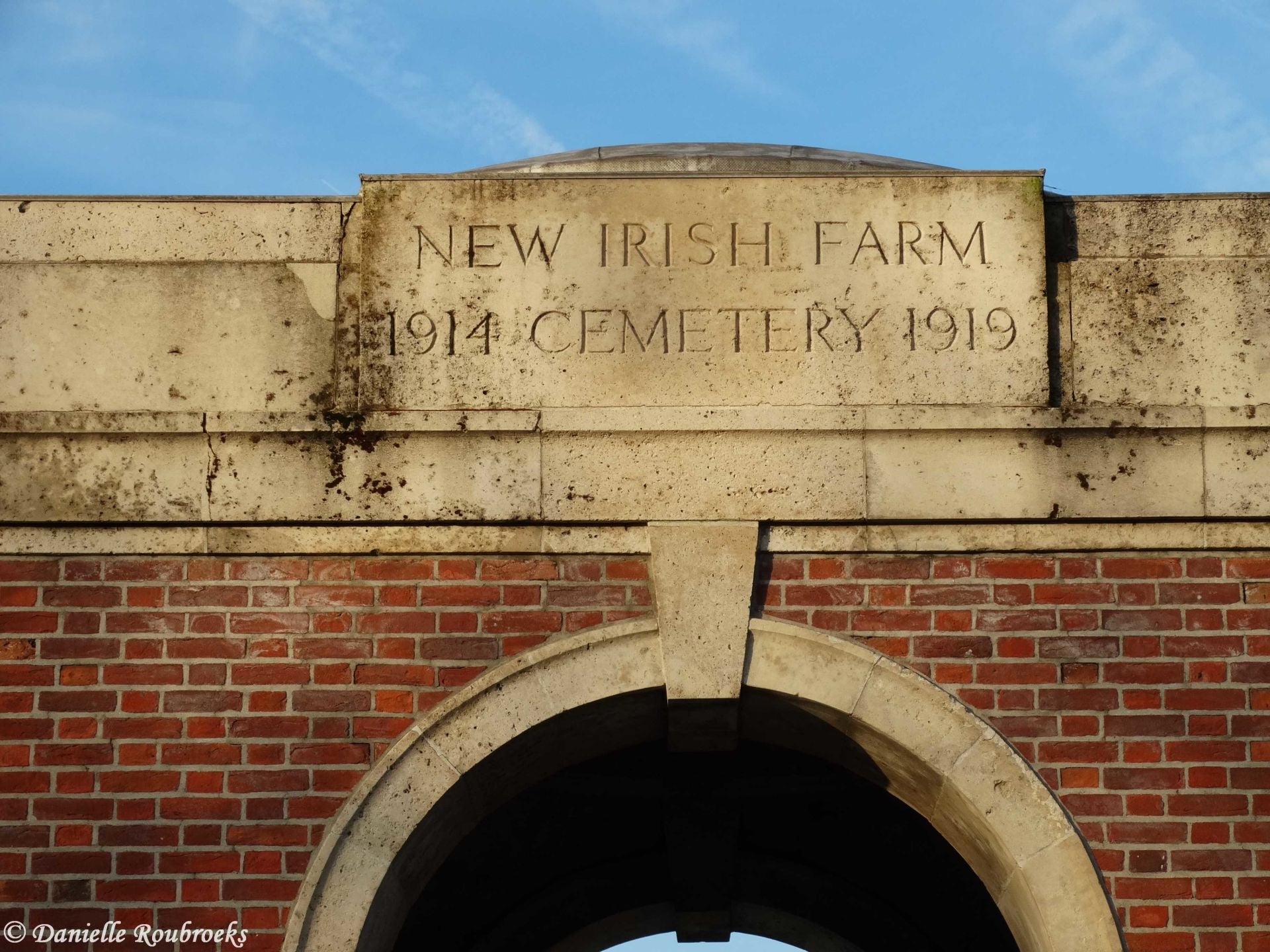 New Irish Farm Cemetery was first used from August to November 1917 and was named after a nearby farm, known to the troops as 'Irish Farm' (originally there was an Irish Farm Cemetery immediately South of the Farm. New Irish Farm Cemetery is about 300 metres North of the Farm at a crossing once known as Hammond's Corner). It was used again in April and May 1918 and at the Armistice it contained just 73 burials - the three irregular rows of Plot I - but was then greatly enlarged when more than 4,500 graves were brought in from the battlefields north-east of Ypres (now Ieper) and from smaller cemeteries.