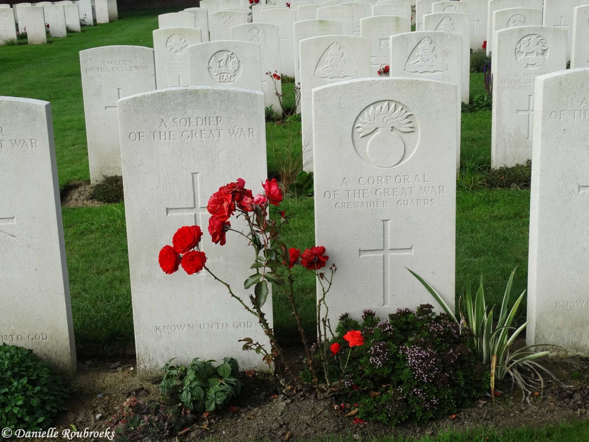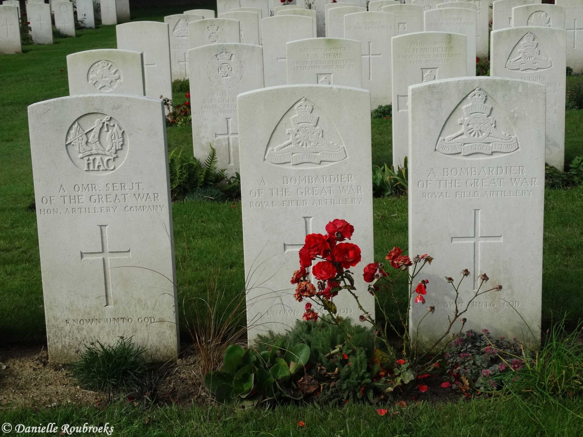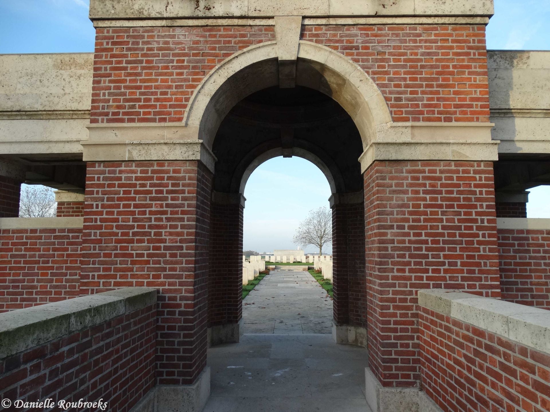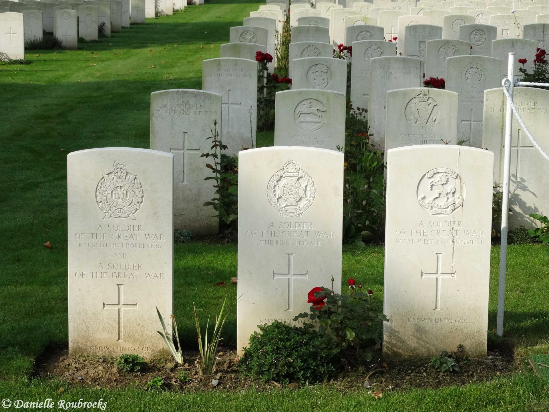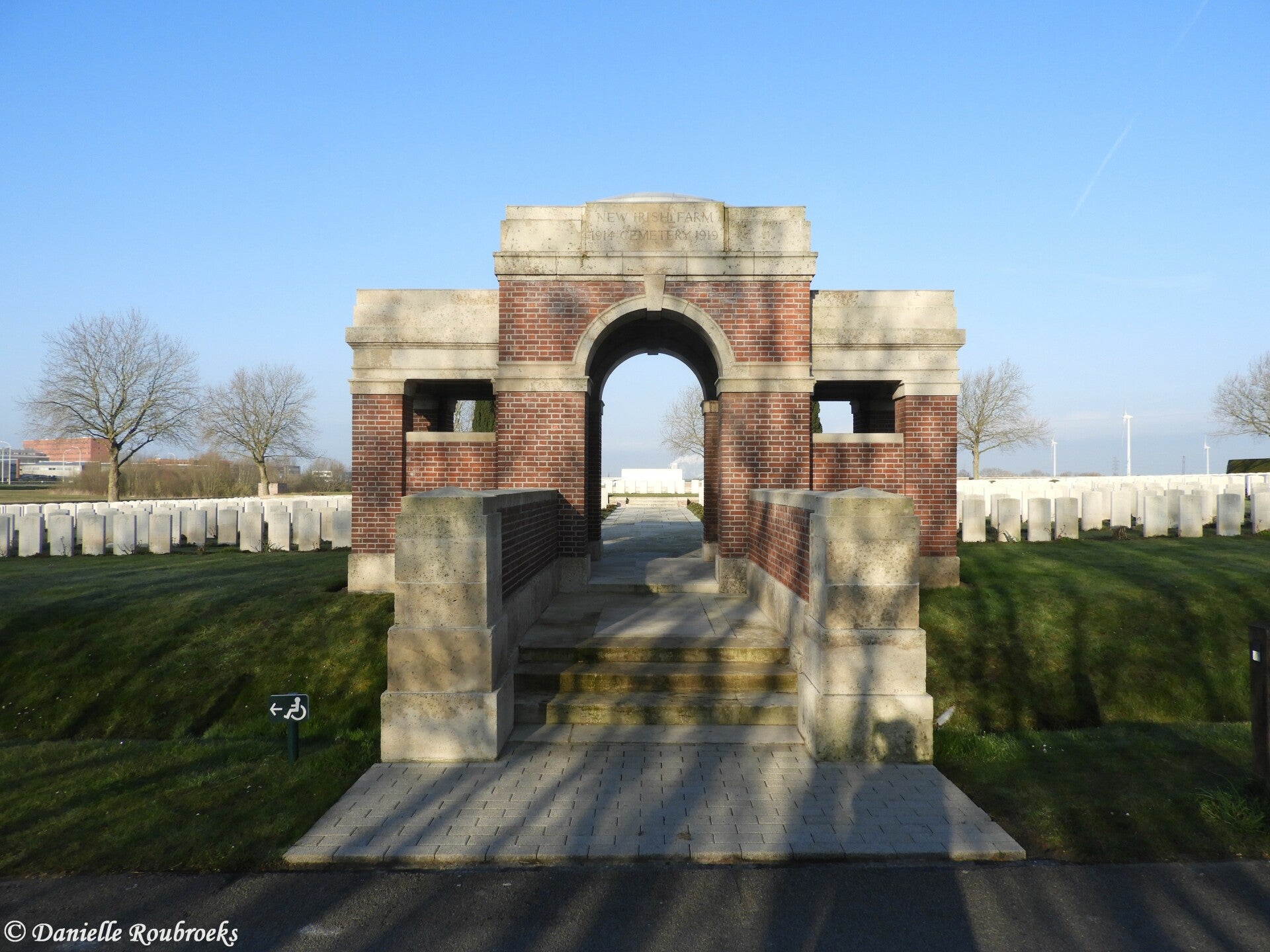 There are now 4,719 commonwealth servicemen of the First World War buried or commemorated in this cemetery. 3,271 of the burials are unidentified, but special memorials commemorate four casualties known or believed to be buried among them. Other special memorials record the names of 30 casualties buried in four of the cemeteries removed to New Irish Farm whose graves were destroyed by shell fire. The cemetery was designed by Sir Reginald Blomfield.