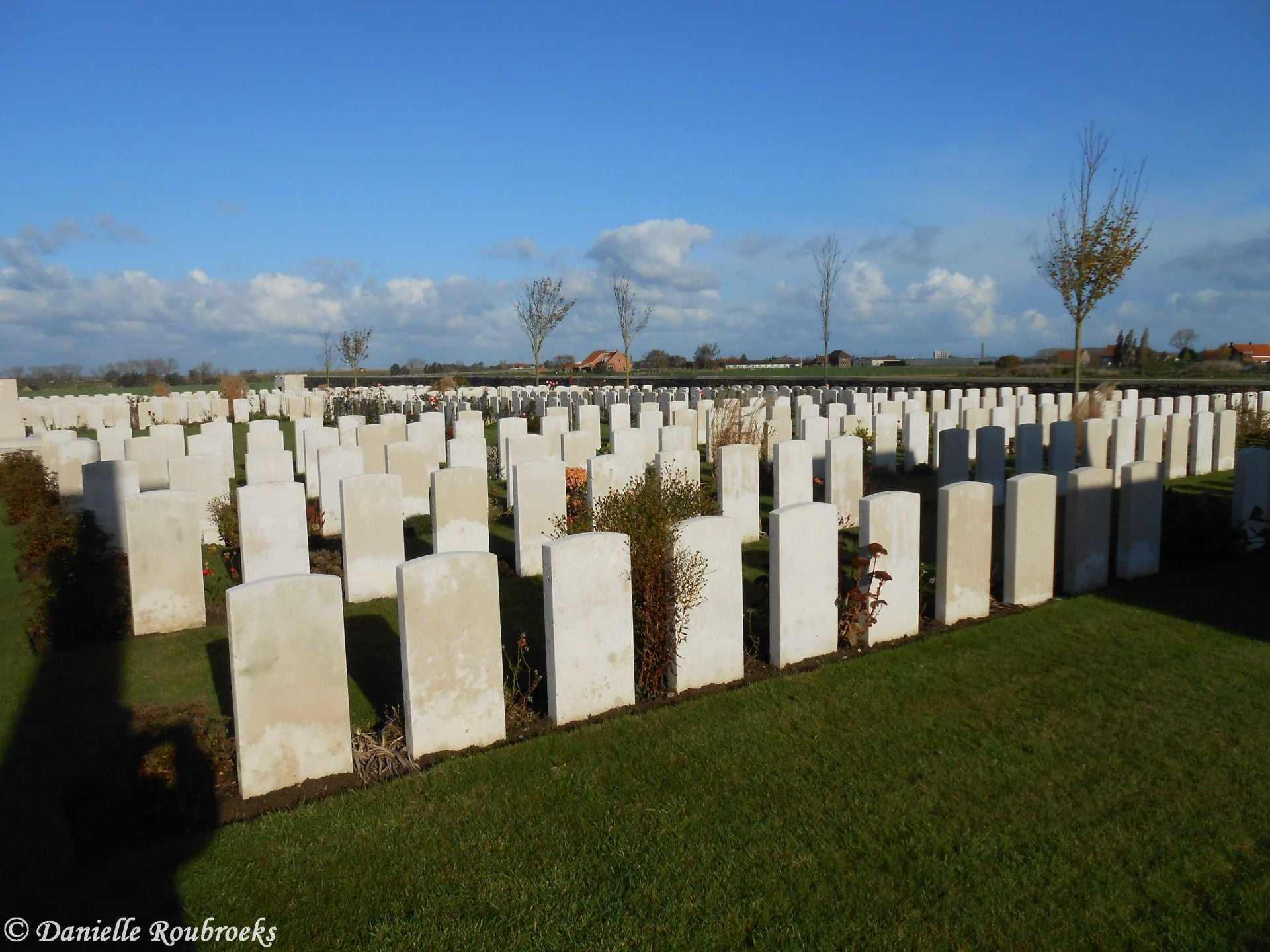 The village of Passchendaele (now Passendale) and surrounding area were associated with every phase of the First World War. In the middle of October 1914, Passchendaele was briefly under Allied occupation but by 20 October it was in German hands, where it remained for the next three years. On 6 November 1917, after the severest fighting in most unfavourable weather, the 5th Canadian Infantry Brigade took, and passed, the village; this fight was part of the Second Battle of Passchendaele, the last of the Battles of Ypres, 1917. In the middle of April 1918, in the Battles of the Lys, the Allied line was withdrawn far back on the road to Ypres, but on 29 September, in the course of the Allied offensive in Flanders, Belgian forces recaptured the village. The New British Cemetery was made after the Armistice when graves were brought in from the battlefields of Passchendaele and Langemarck. Almost all of the burials are from the autumn of 1917.