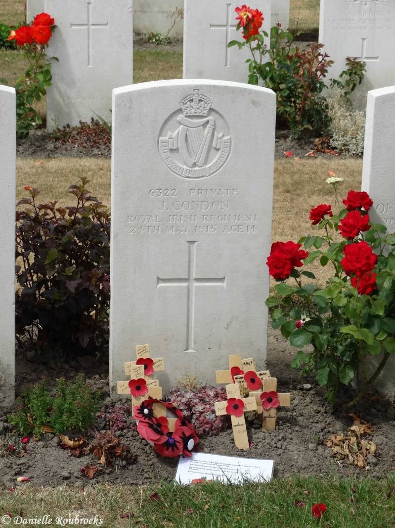 Among those buried in the cemetery is Private John Condon of the Royal Irish Regiment, who at 14 is thought to be the youngest battle casualty of the First World War commemorated by the Commission.