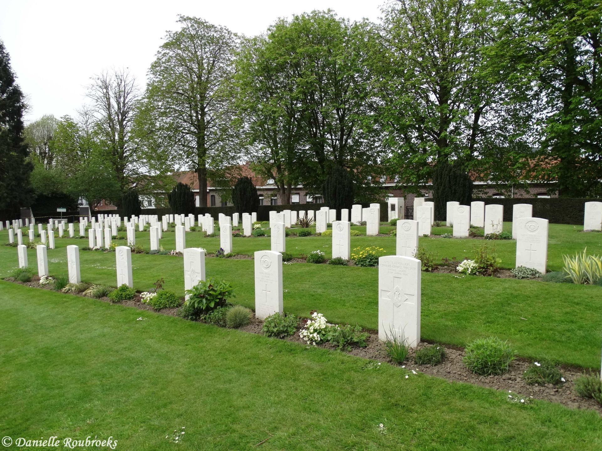 From October 1914 to the summer of 1918, Ypres (now Ieper) formed the centre of a salient held by Commonwealth (and for a while French) forces. From April 1915, the town was bombarded and destroyed more completely than any other town of its size on the western front. The cemetery is by the Lille Gate, on top of the old rampart, over what had been dug-outs. It was begun by French troops in November 1914 and used by Commonwealth units at intervals from February 1915 to April 1918.