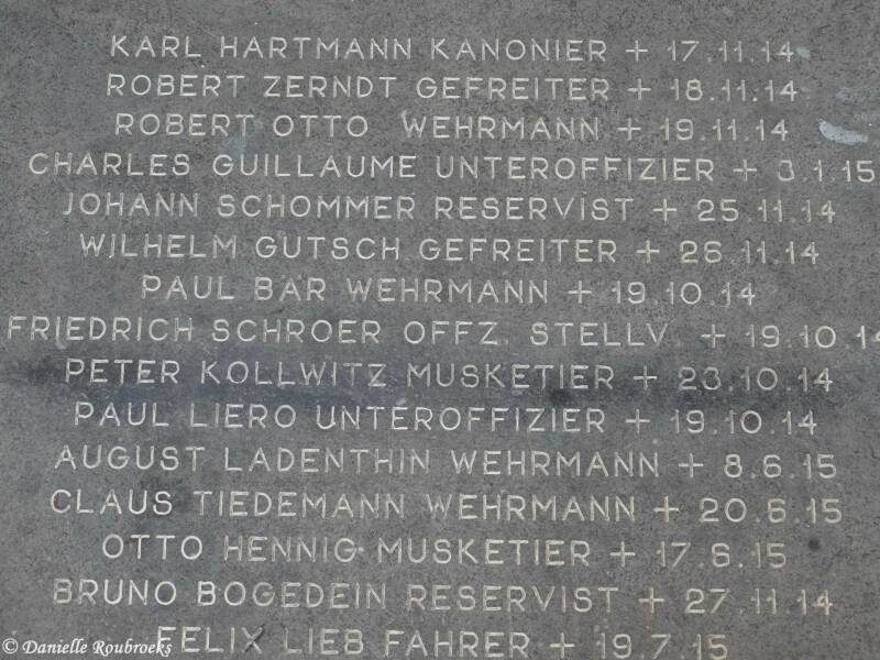 The cemetery also contains a pair of statues – The Grieving Parents – by Käthe Kollwitz, a noted German sculptress. She made the statues in the 1930s as a tribute to her youngest son, Peter, who was killed in October 1914 and is buried in the cemetery. The eyes on the father-figure gaze on the ninth stone before him, on which Kollwitz’s son's name is written.