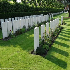 The EXTENSION, on the east side of the town cemetery, was also begun in October 1914 and was used until April 1915, and on two further occasions in 1918. The extension was much increased after the Armistice when 367 graves were brought in from small cemeteries and isolated positions east and north of Ypres. During and after the fighting of May 1940, three civilian hospitals in the town, (Hopital de Notre Dame, the Clinique des Soeurs Noires and the Red Cross Hospital in St. Aloisius School, D'Hondstraat), cared for the wounded, and those who died were buried in the Town Cemetery Extension. Others buried on the battlefield were later brought in by the Ypres town services.