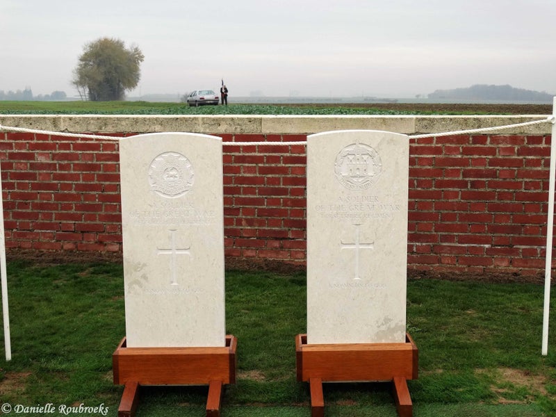 Their remains were discovered with regimental artefacts during road works round the town of Albert. However, despite intensive research, including DNA testing, it was not possible to name either of them. It is believed both men were killed in action in spring or early summer 1918.
