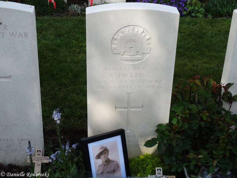 Reginald Hickling was born on the 25th April 1895 and enlisted in the 1st AIF on 6th July 1916. After arriving in Egypt and training with the 11th Battalion he became one of the original members of the 51st Battalion when the Australian 4th Division was raised. 2LT Hickling was KIA by shellfire, at Broodseinde, on 12 October 1917. His final resting place was unknown until researchers from Fallen Diggers Inc discovered his grave in Tyne Cot Cemetery, Belgium in 2015.