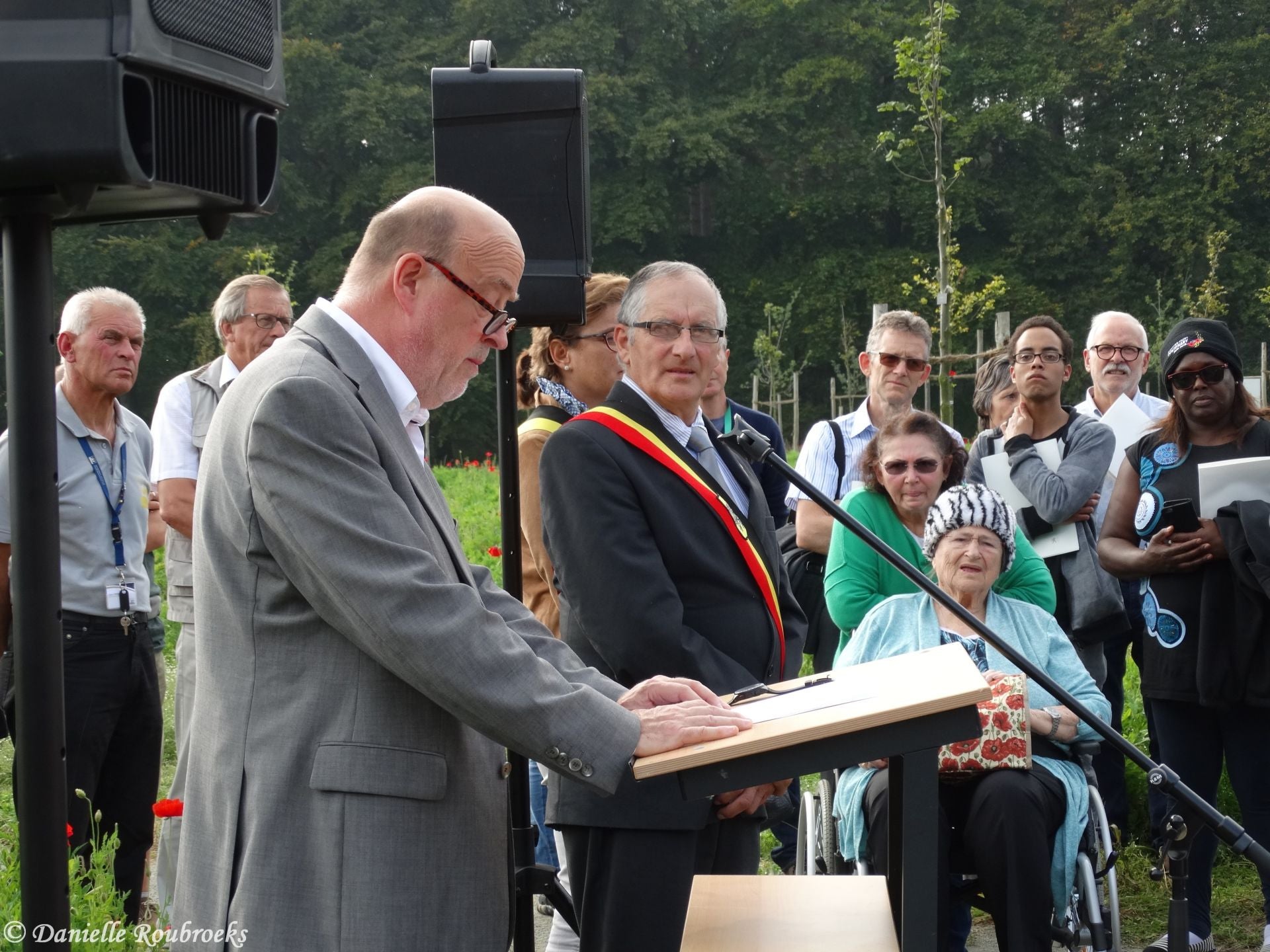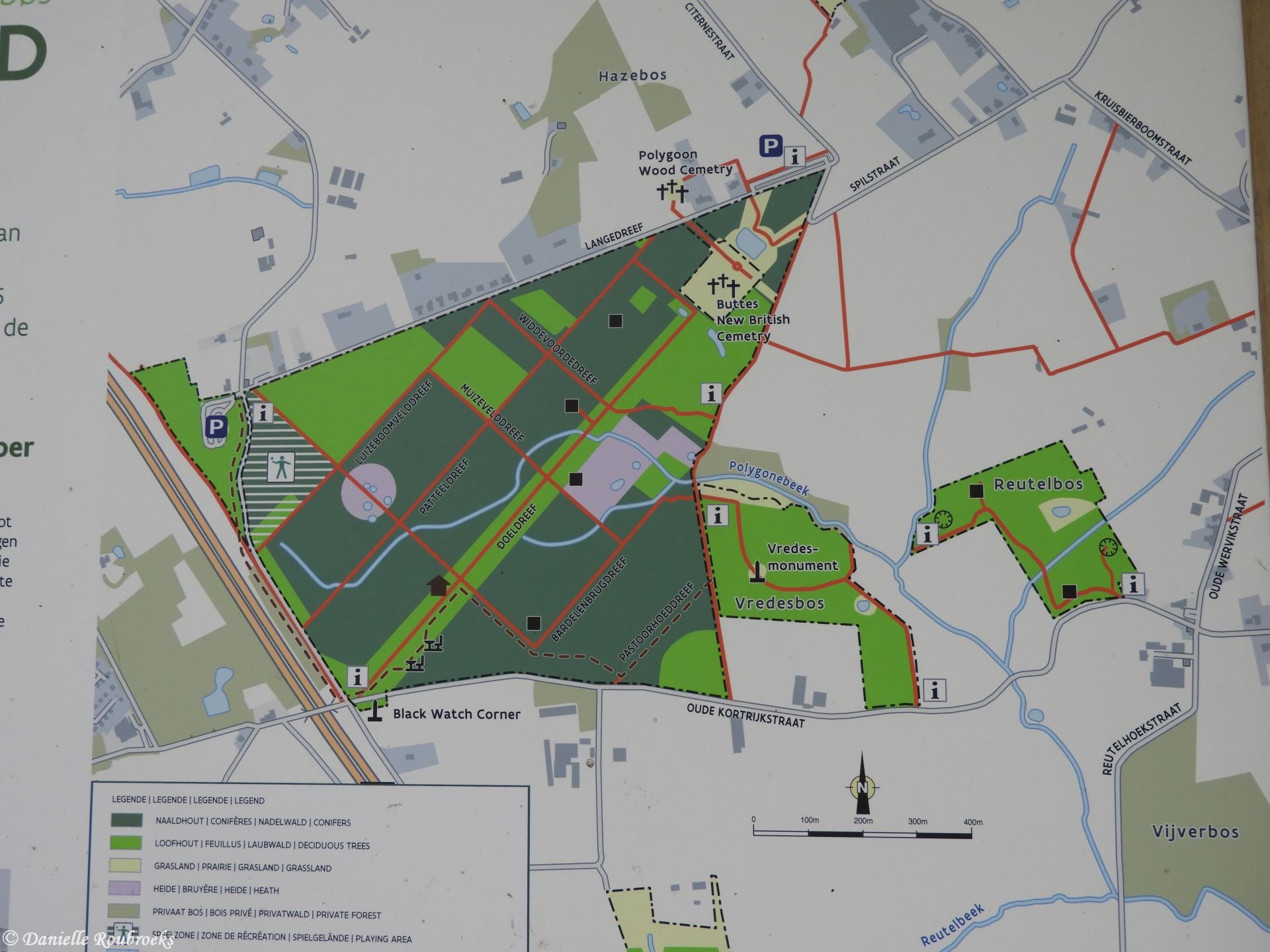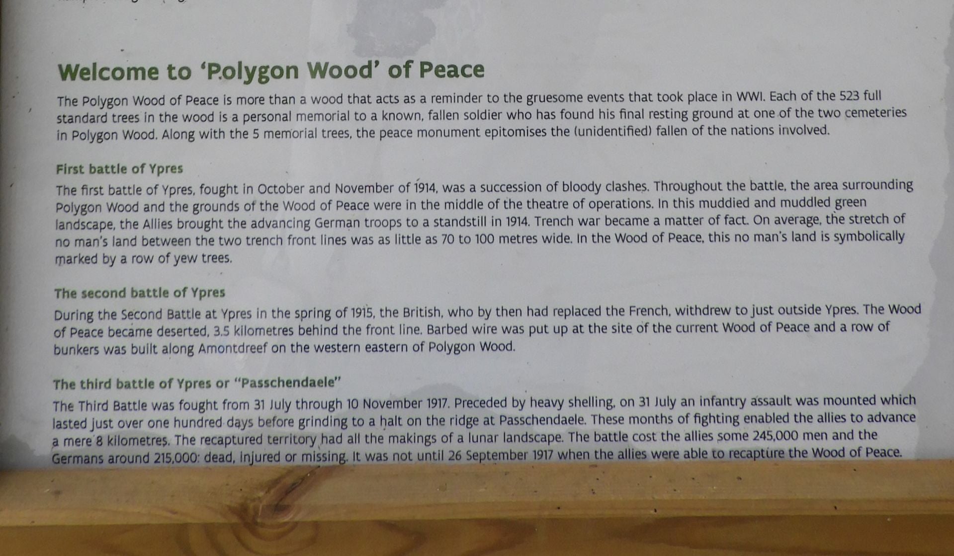 100 years after the battle of Passchendaele, a tree is planted for every fallen soldier with a known grave in the two British cemeteries of Polygon Wood. A monument of all missing soldiers is in the central area in the new park. Every tree is dedicated to an identified fallen soldier. There are 523 of them. No distinctions are made in ranks, social position or nationality for the layout of the wood.