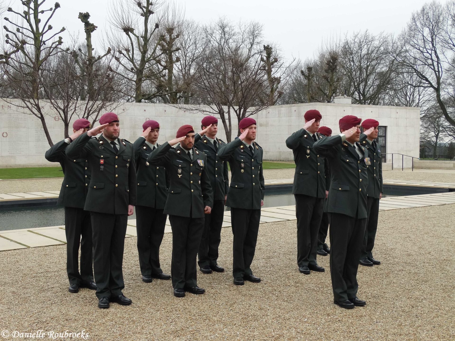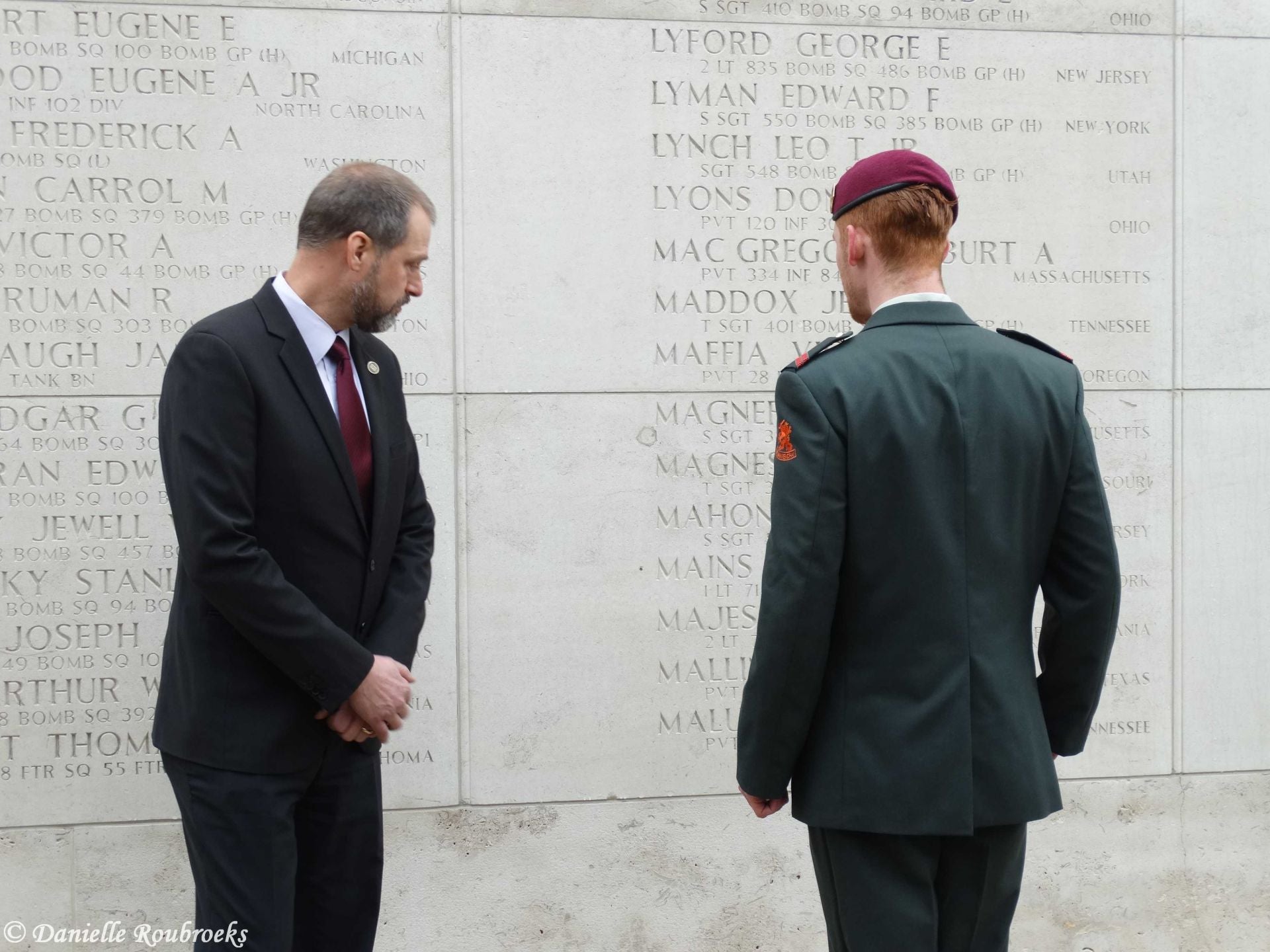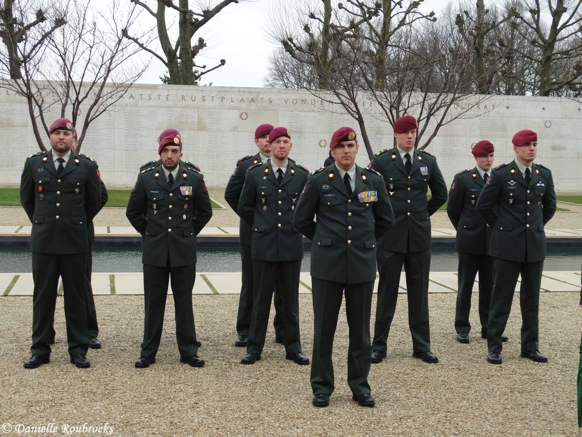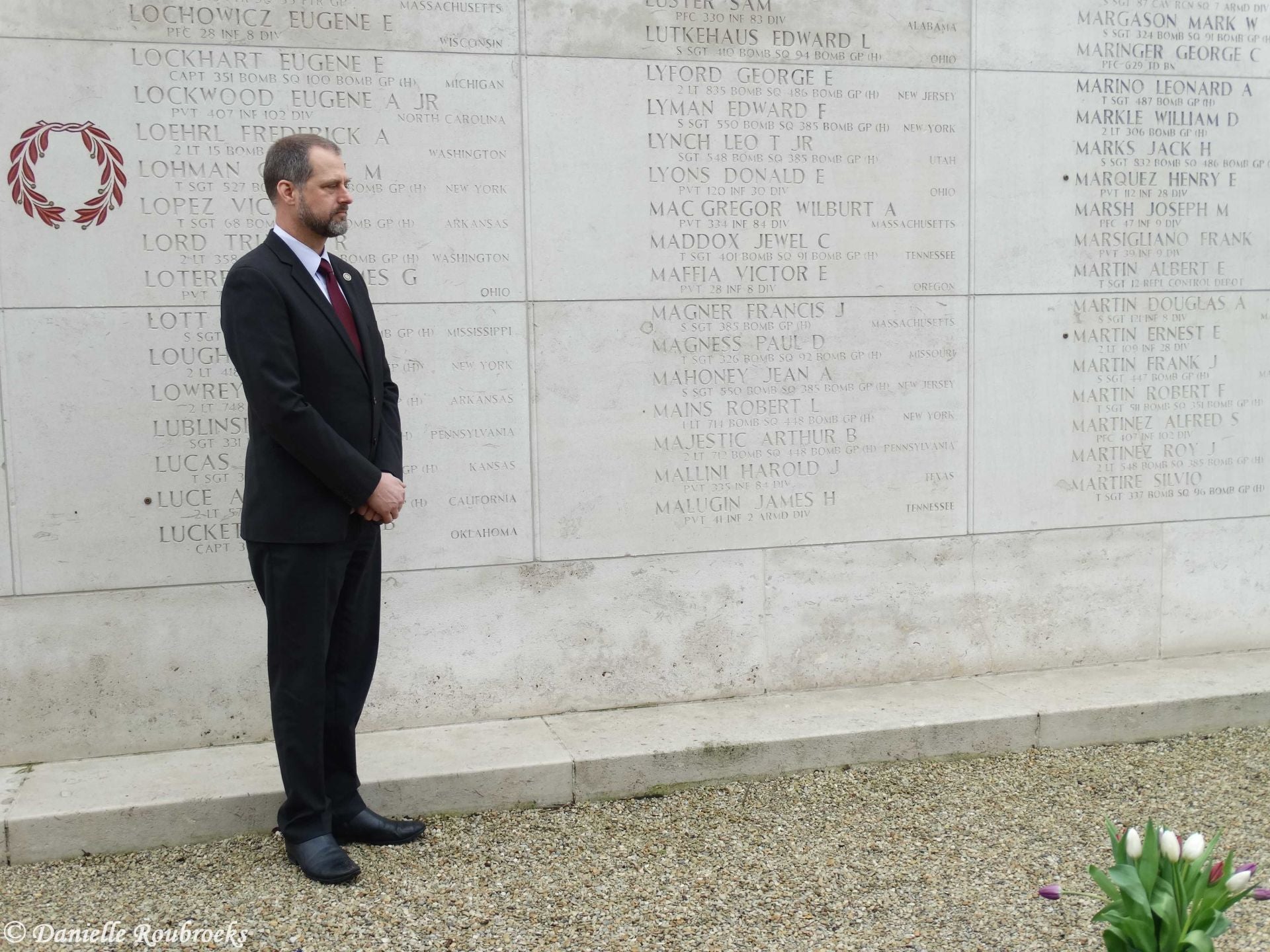 At the names of five missing American soldiers on the Wall of Missing in the Margraten cemetery, rosettes were placed on Thursday, March 22, 2018 because these men have been found and identified. A mortar group of the Airmobile Brigade was also present at this ceremony.