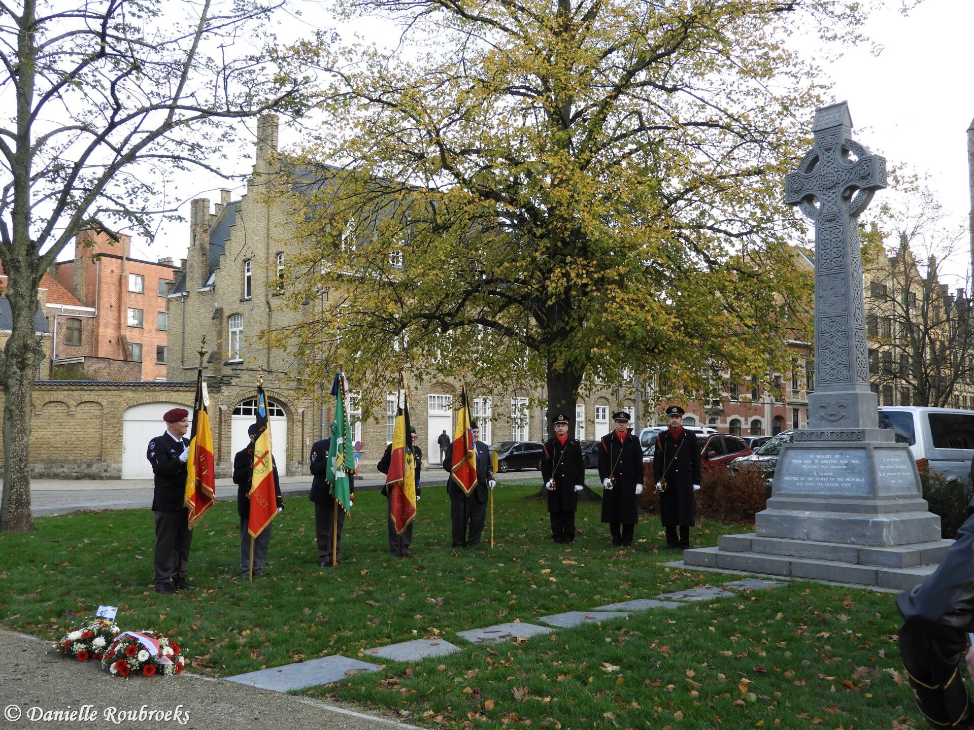 The Irish Cross is a war memorial in the Belgian city of Ypres. The cross was erected in 1924, in memory of the soldiers from Munster (Ireland) who fell in the Ypres Salient during the First World War. The cross stands on a rectangular base on an elevation of four steps and it is located behind St. Martin's Cathedral. Makers were J.A. O'Connell (Cork) and Alb. Cremer (Ypres). The monument is a Celtic cross with a gable roof. Furthermore, the cross is covered on three sides with wickerwork motifs in relief. A three-crowned coat of arms is depicted on the upper base. The whole is 5.43 meters high; 3.41 meters wide and 2.65 meters deep.
