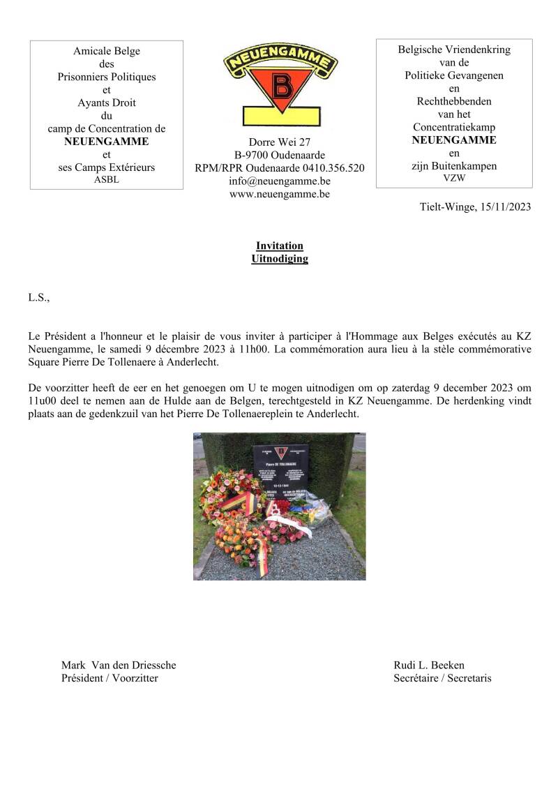 De Tollenaere was a welder. On July 22, 1941, a few weeks after the start of Operation Barbarossa, he was arrested. During this period, the Germans arrested many Belgian communists and socialists. Together with 255 other Belgians, he was put on the first Belgian transport to a concentration camp. After a journey of 2 days, he reached camp Neuengamme on September 24, 1941. He became a member of the Belgian Solidarity and Resistance Committee, which was led by Julien Lahaut and later by André Mandrycxs.