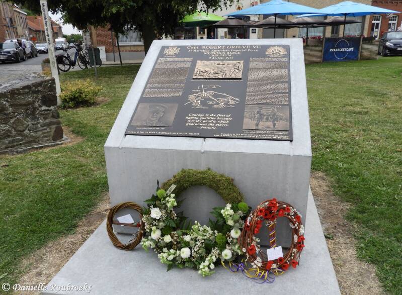 A memorial plaque for Captain Robert C Grieve VC was inaugurated in the Market Square at Mesen (Messines) on Sunday 9 July 2023 at 11am, by Sandy Evrard, Mayor of Mesen, and Nick Evans, Principal of Wesley College, Melbourne.