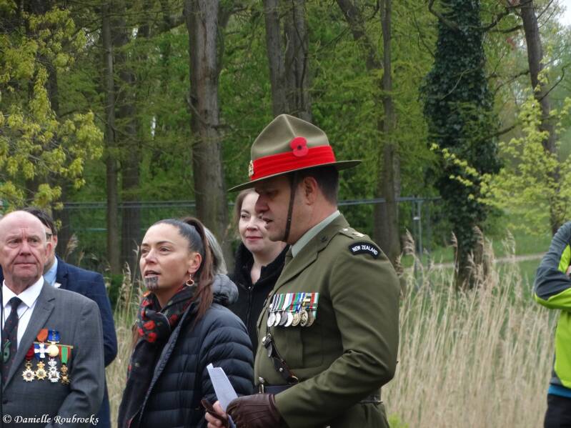 Anzac Day ceremony on Thursday 25th April 2024 at MMP 1917 Zonnebeke, wreath laying at the Pou Maumahara (memorial carving)