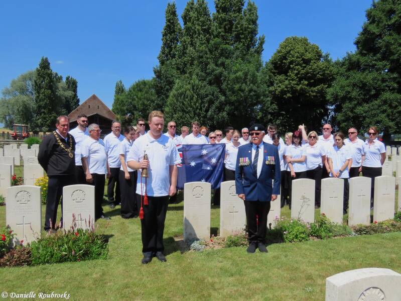 More than 108 years after a fallen Australian soldier, Private George Eyre, was separated from the item that reminded him of home, an emotional reunion occurred at Moeuvres Communal Cemetery Ext in France on Wednesday 18th June 2025. The honour of performing the Last Post by the gravesite has been given to the City of Traralgon Bands’ 19-year-old bugler, Lachlan Wilson.