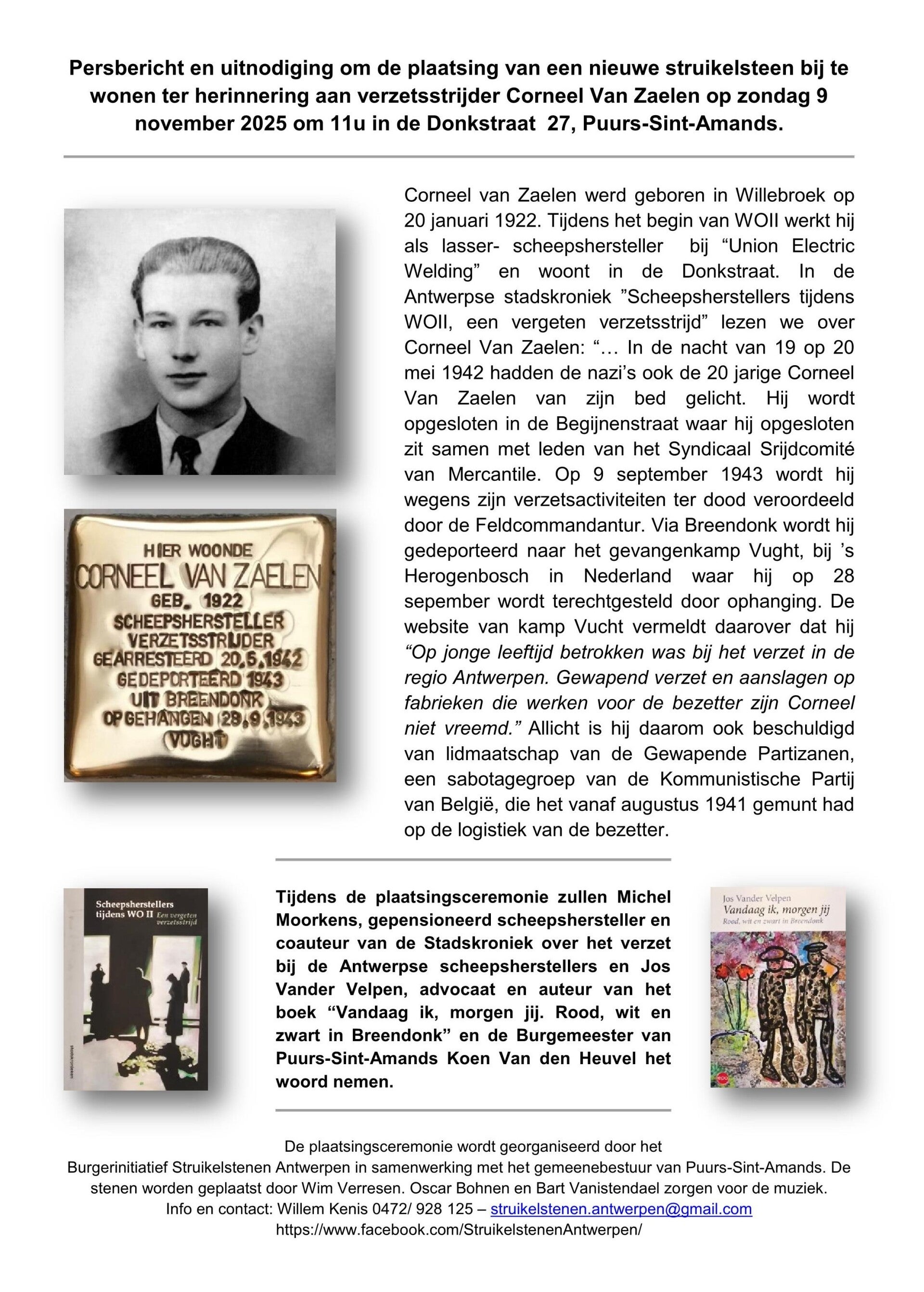 Sunday 9th November 2025 one stumbling stone was placed for Corneel Van Zaelen in the Donkstraat 27 in Puurs-Sint-Amands.