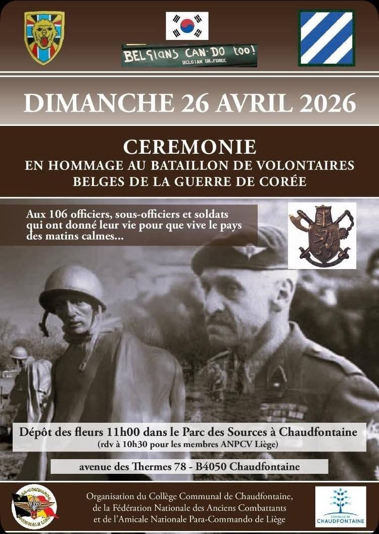 The Municipal Council, along with the National Federation of Veterans and the Liège Regional National Para Commando Association, are pleased to invite you to attend the ceremony honoring the Belgian Volunteer Battalion of the Korean War, which will take place on Sunday, April 26, 2026, at 11:00 a.m. in the Parc des Sources.
