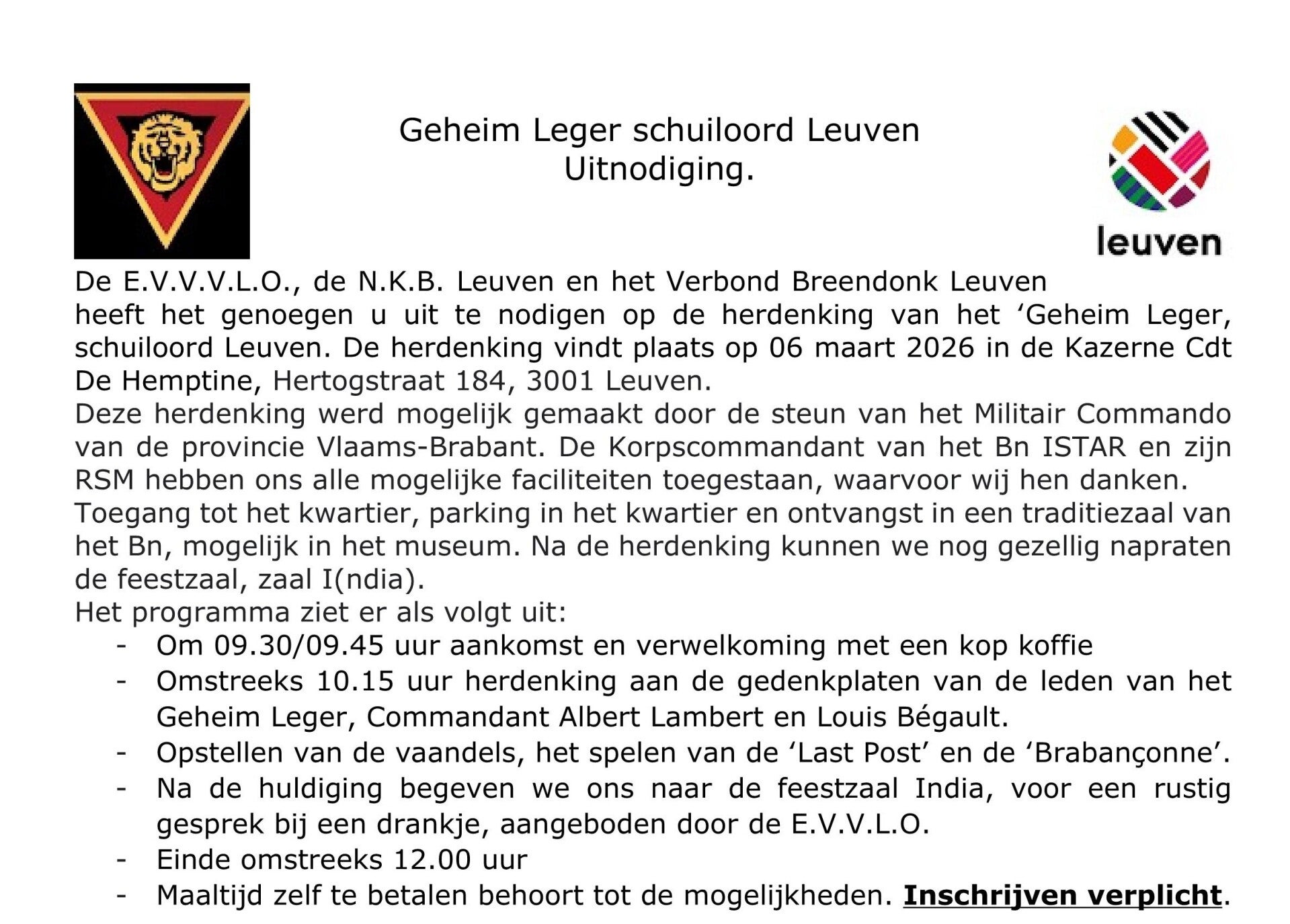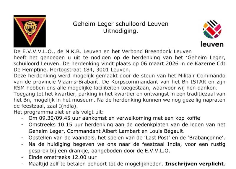Commemoration of the 'Secret Army – Shelter Leuven' in the Cdt de Hemptinne barracks in Heverlee on Friday 6th March 2026.