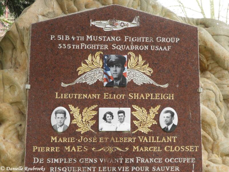 On 27 May 1944, Lt. Shapleigh baled out near Laon, France, in his P-51 Mustang 42-106464, aborted escort mission to Karlsruhe, because of engine trouble. He was picked up by the French Underground and hidden in a secret room in a private home until the area was overrun by American Forces who repatriated him.