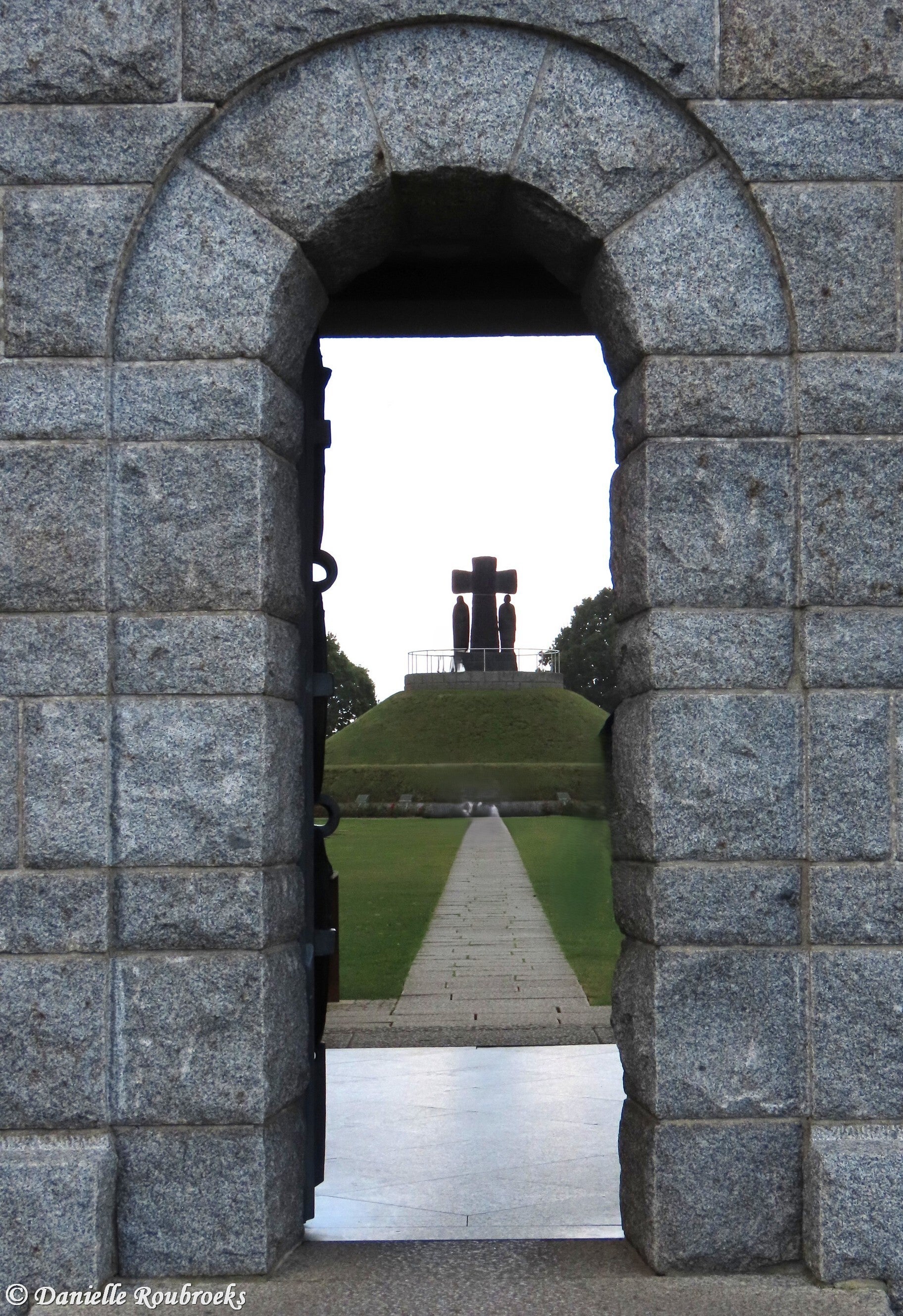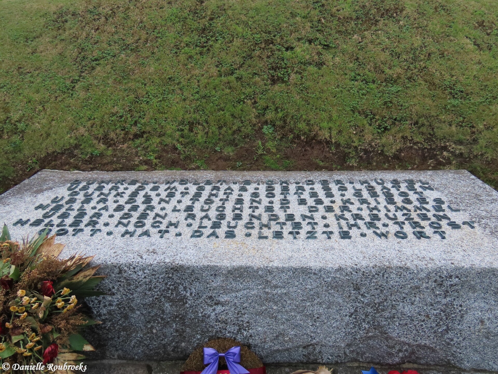 In the center of the cemetery lies a mound adorned with a basalt cross flanked by two figures and the inscription: "Gott hat das letzte Wort" (God has the last word). Around this mound, the graves are divided into 49 rectangular plots, some containing up to 400 graves. These plots are marked by flat slabs in the grass, interspersed with groups of five basalt crosses at regular intervals.