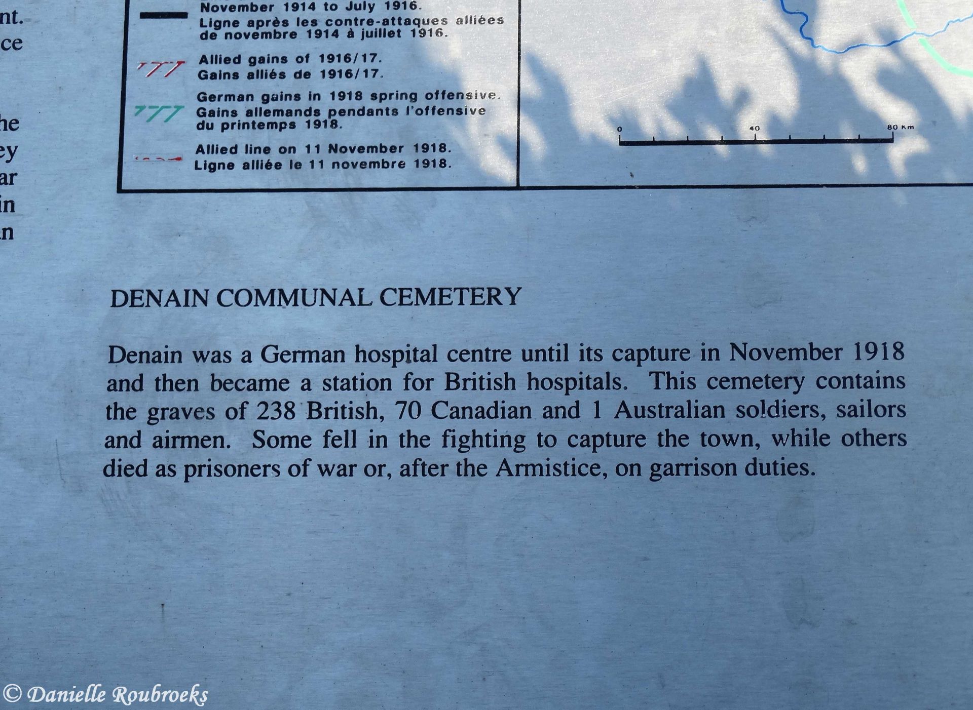 Denain was a German hospital centre during the greater part of the War; and from the 1st November, 1918, to the 12th March, 1919, the 33rd Casualty Clearing Station was posted in the town. The Communal Cemetery, was used by the Germans to bury their soldiers and (in 1917 and 1918) 153 British prisoners. A British plot was made at the South-East end, after the capture of the town; and after the Armistice the graves of the prisoners and other British graves were regrouped beside it.