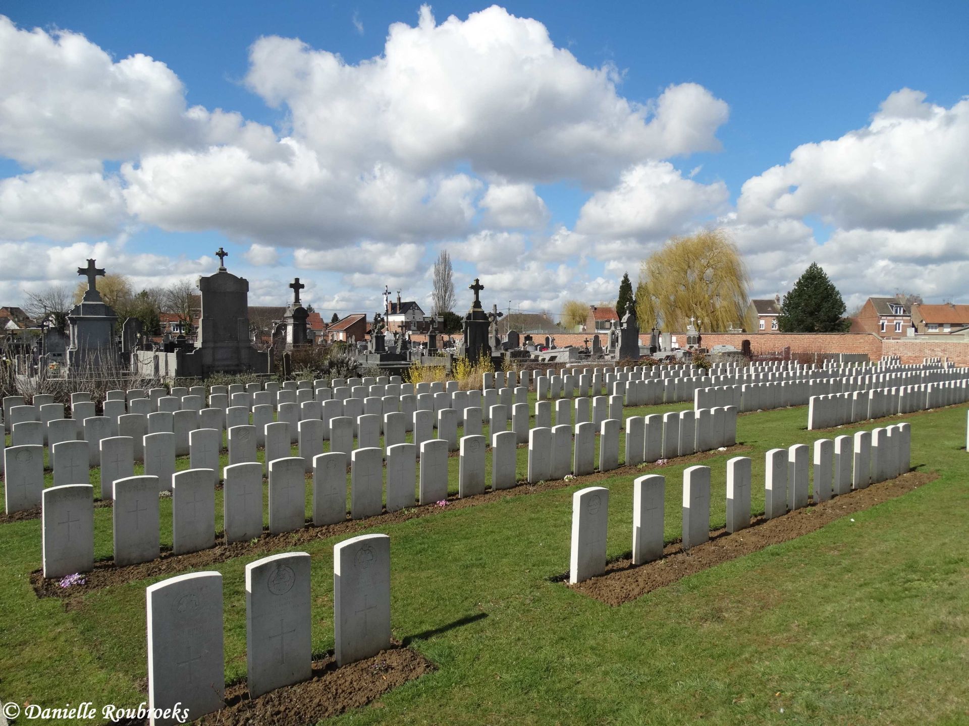 It now contains 1,268 Commonwealth burials of the First World War, and 12 French war graves. There is also 1 non war burial. The Extension was opened in August 1916, and used by Commonwealth and Portuguese hospitals until April 1918. It was enlarged after the Armistice when graves were brought in from the battlefields immediately north and east of Merville and from the following cemetery:- CAUDESCURE HALTE CEMETERY, MORBECQUE, which was close to the road and the light railway from Merville to Hazebrouck, and just within the Bois-Moyen. It was made by fighting units, and it contained the graves of 38 soldiers from the United Kingdom who fell in the period April-August, 1918.