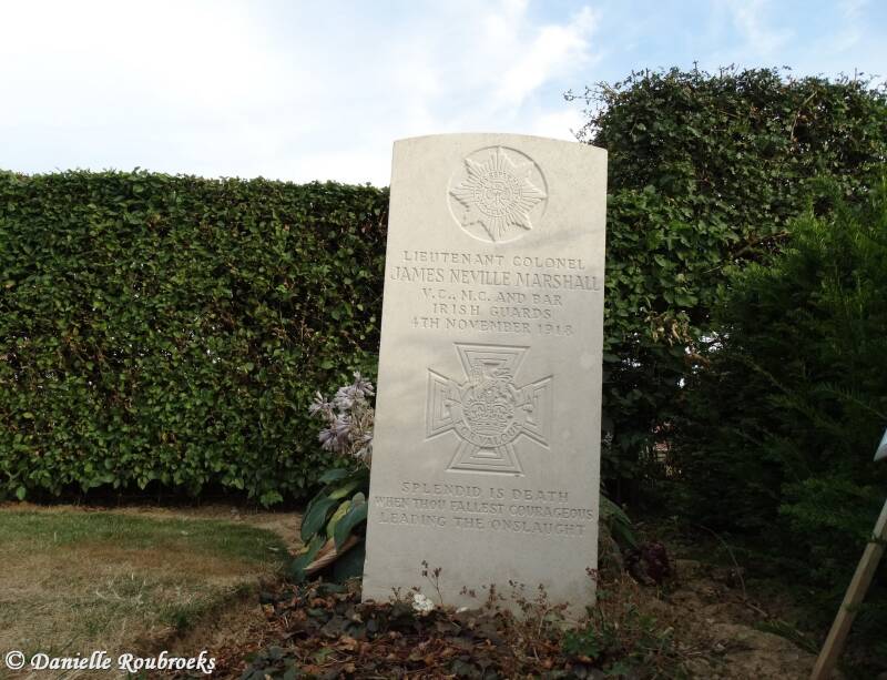 An extract from "The London Gazette," No. 31178, dated 13th Feb., 1919, records the following:- "For most conspicuous bravery, determination and leadership in the attack on the Sambre-Oise Canal, near Catillon, on the 4th November, 1918, when a partly constructed bridge came under concentrated fire and was broken before the advanced troops of his battalion could cross. Lt. Col. Marshall at once went forward and organised parties to repair the bridge. The first party were soon killed or wounded, but by personal example he inspired his command, and volunteers were instantly forthcoming. Under intense fire and with complete disregard of his own safety, he stood on the bank encouraging his men and assisting in the work, and when the bridge was repaired attempted to rush across at the head of his battalion and was killed while so doing. The passage of the canal was of vital importance, and the gallantry displayed by all ranks was largely due to the inspiring example set by Lt. Col. Marshall."