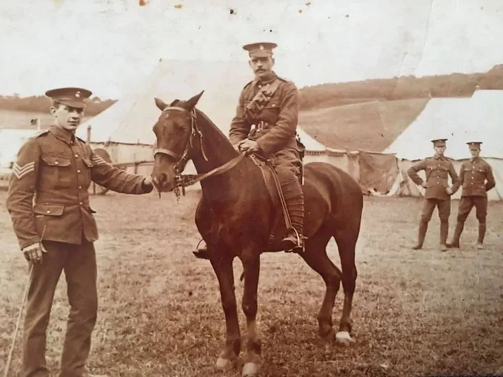 Griffith Vaughan, here sitting on his horse, signed up for the Canadian Overseas Expeditionary Force on the 20th September 1914 in Valcartier, Quebec. Born on the 18th October 1882 in Wrexham, North Wales. He was a ‘Core maker’ and had previously served 3 years in the Manchester Regiment in the UK.