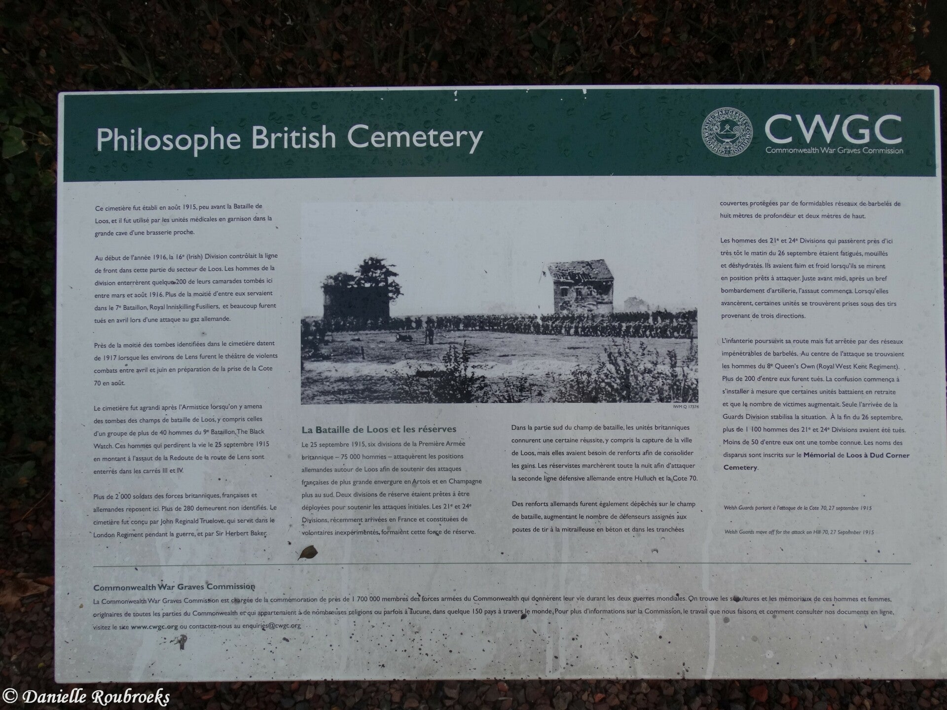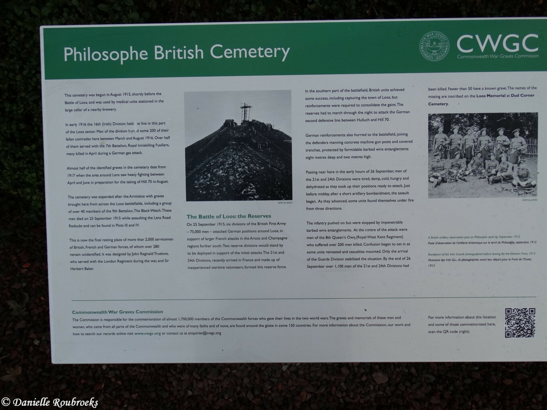 The cemetery was started in August 1915. In 1916 it was taken over by the 16th (Irish) Division, who held the Loos Salient at the time, and many of their dead were brought back to the cemetery from the front line. Succeeding divisions used the cemetery until October 1918, and men of the same Division, and often the same battalion, were buried side by side. After the Armistice, this cemetery was one of those used for the concentration of isolated graves from the Loos battlefield. The bodies of 41 men of the 9th Black Watch were brought from positions a little West of Loos, and those of 340 officers and men of other Regiments from different points in the communes of Cambrin, Auchy, Vermelles, Halluch and Loos.