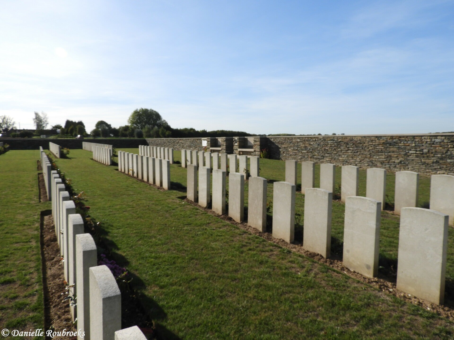 There are now over 250, 1914-18 war casualties commemorated in this site. Of these, a small number are unidentified. The Cemetery covers an area of 1,015 square metres and is enclosed by a low rubble wall. 274 metres to the West is a Battle Memorial erected by the 42nd Division.