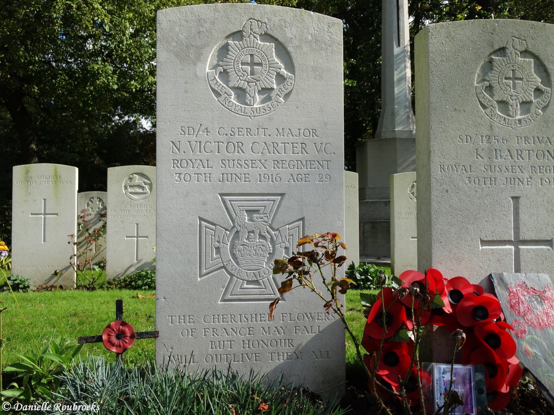An extract from the "London Gazette," No. 29740, dated 8th Sept., 1916, records the following:-"For most conspicuous bravery. During an attack he was in command of the fourth wave of the assault. Under intense shell and machine gun fire he penetrated, with a few men, into the enemy's second line and inflicted heavy casualties with bombs. When forced to retire to the enemy's first line, he captured a machine gun and shot the gunner with his revolver. Finally, after carrying several wounded men into safety, he was himself mortally wounded and died in a few minutes. His conduct throughout the day was magnificent."