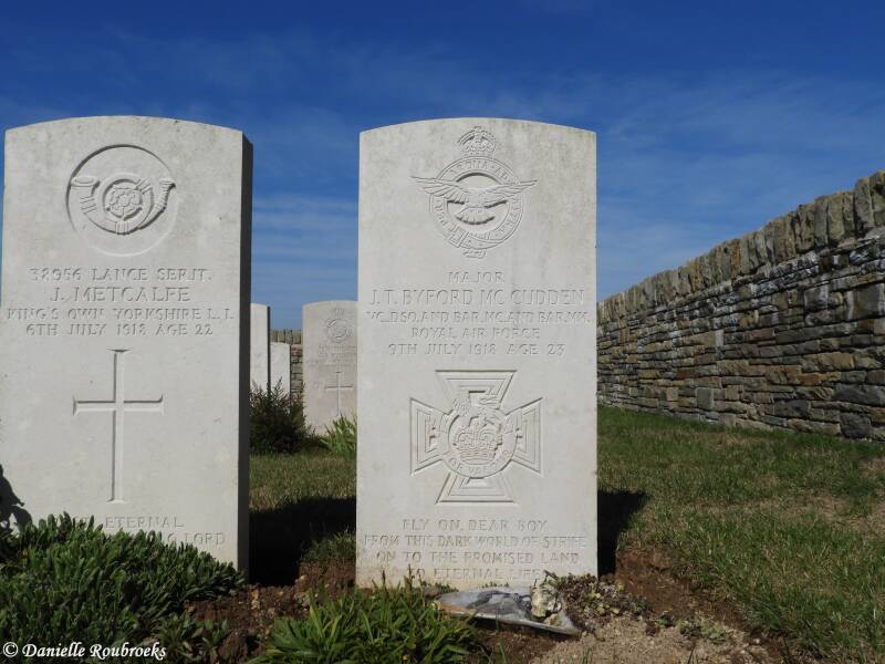 The cemetery contains 43 Commonwealth burials of the First World War and one German war grave. Among those buried in the cemetery is the flying ace Major J T B McCudden, VC, DSO and Bar, MC and Bar, MM, who died of wounds in July 1918.