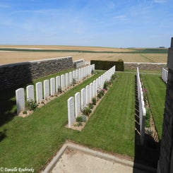 Flers was captured on 15 September 1916, in the Battle of Flers-Courcelette, when it was entered by the New Zealand and 41st Divisions behind tanks, the innovative new weapons that were used here for the first time. The village was lost during the German advance of March 1918 and retaken at the end of the following August by the 10th West Yorks and the 6th Dorsets of the 17th Division. The cemetery was begun by Australian medical units, posted in the neighbouring caves, in November 1916-February 1917. These original graves are in Plot I, Rows A and B. It was very greatly enlarged after the Armistice when almost 4,000 Commonwealth and French graves were brought in from the battlefields of the Somme, and later from a wider area.