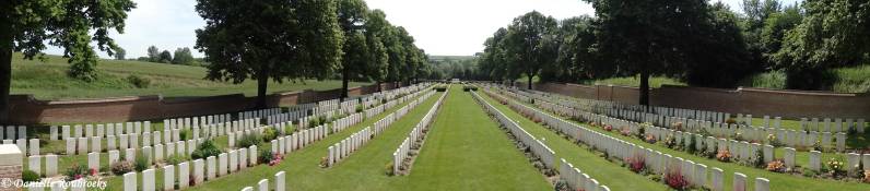 There are now 2,540 Commonwealth casualties of the First World War buried or commemorated in the cemetery. 1,335 of the graves are unidentified, but special memorials commemorate 43 casualties known or believed to be buried among them. There are also special memorials to 16 casualties know to have been buried in other cemeteries, whose graves were destroyed by shell fire. The cemetery was designed by Sir Reginald Blomfield.