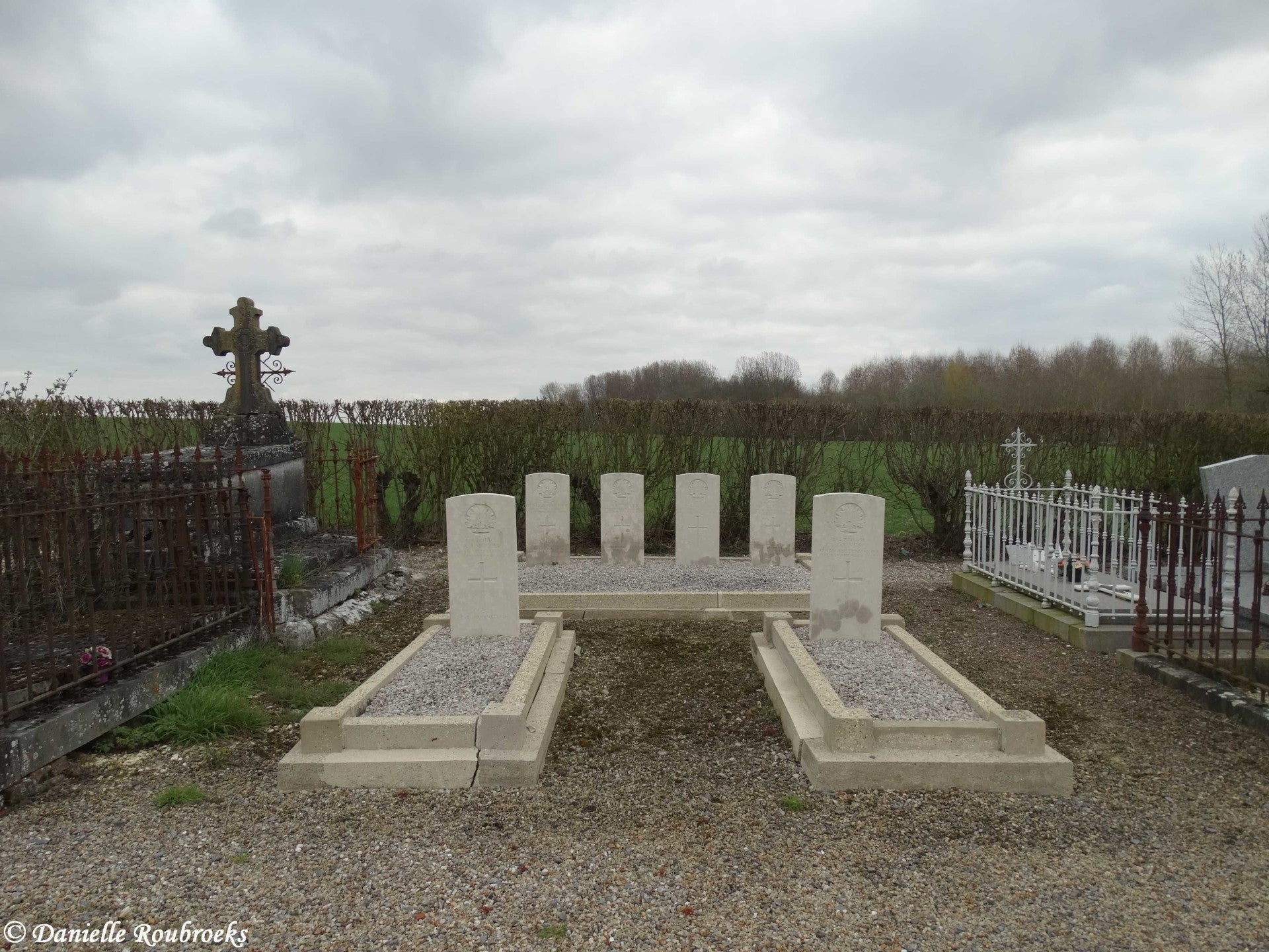 Buire Communal Cemetery contains the Commonwealth war graves of six soldiers from Australia, and two from the United Kingdom, in three groups; Row A is on the west side of the Calvary at the end of the cross-path, and Rows B and C are on the east side at the other end of the cross-path.