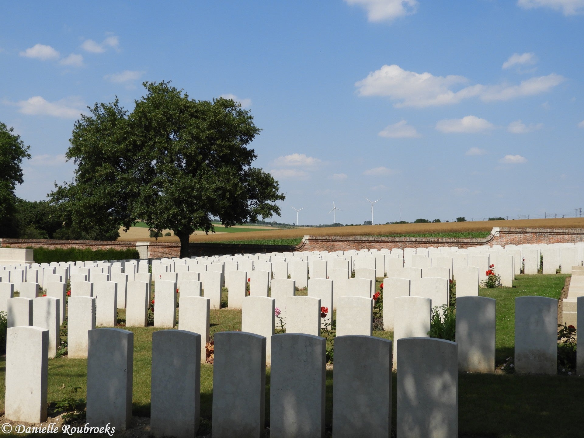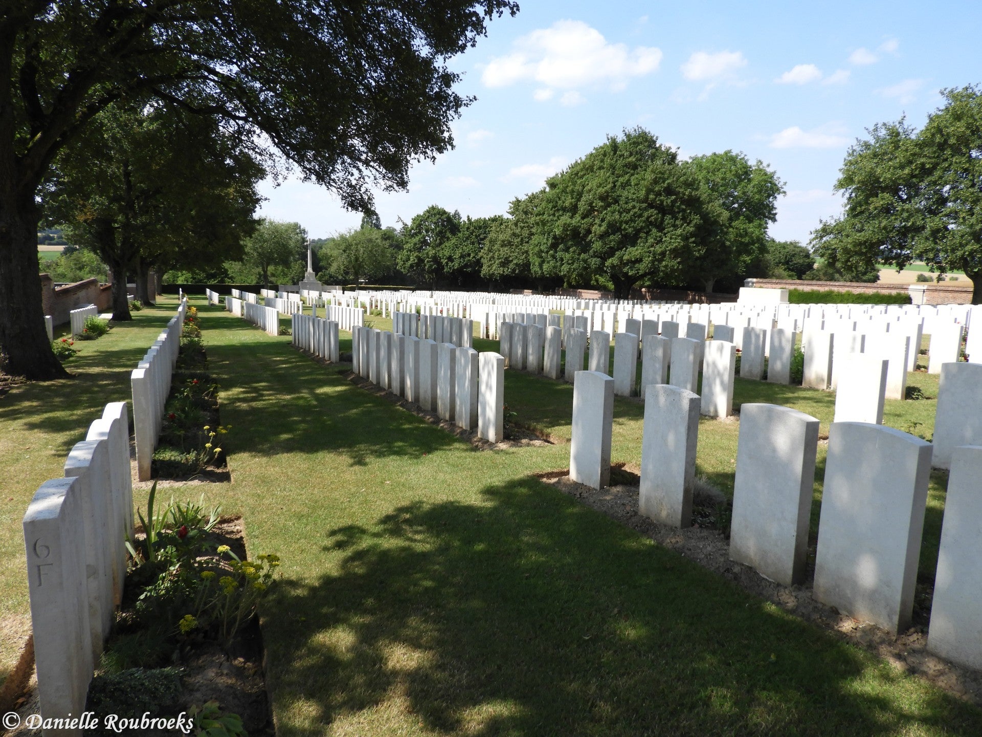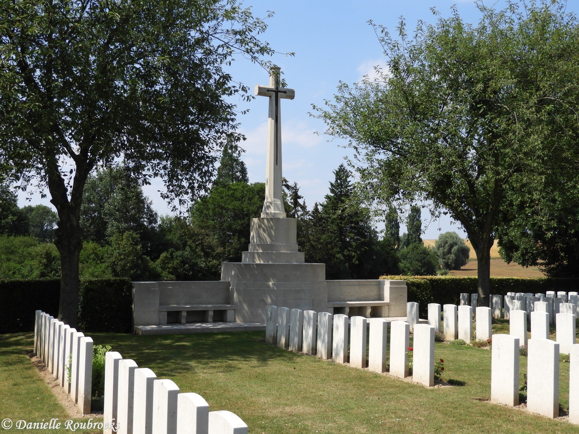 There are now over 1,500, 1914-18 war casualties commemorated in this site. Of these, over half are unidentified and special memorials are erected to nine soldiers from the United Kingdom and one from South Africa, known or believed to be buried among them. Other special memorials record the names of three soldiers from the United Kingdom, buried in Maurepas and Longtree Dump Military Cemeteries, whose graves were destroyed by shell fire. The Extension covers an area of 5,356 square metres. It is enclosed by brick walls on the North-East and South-West.