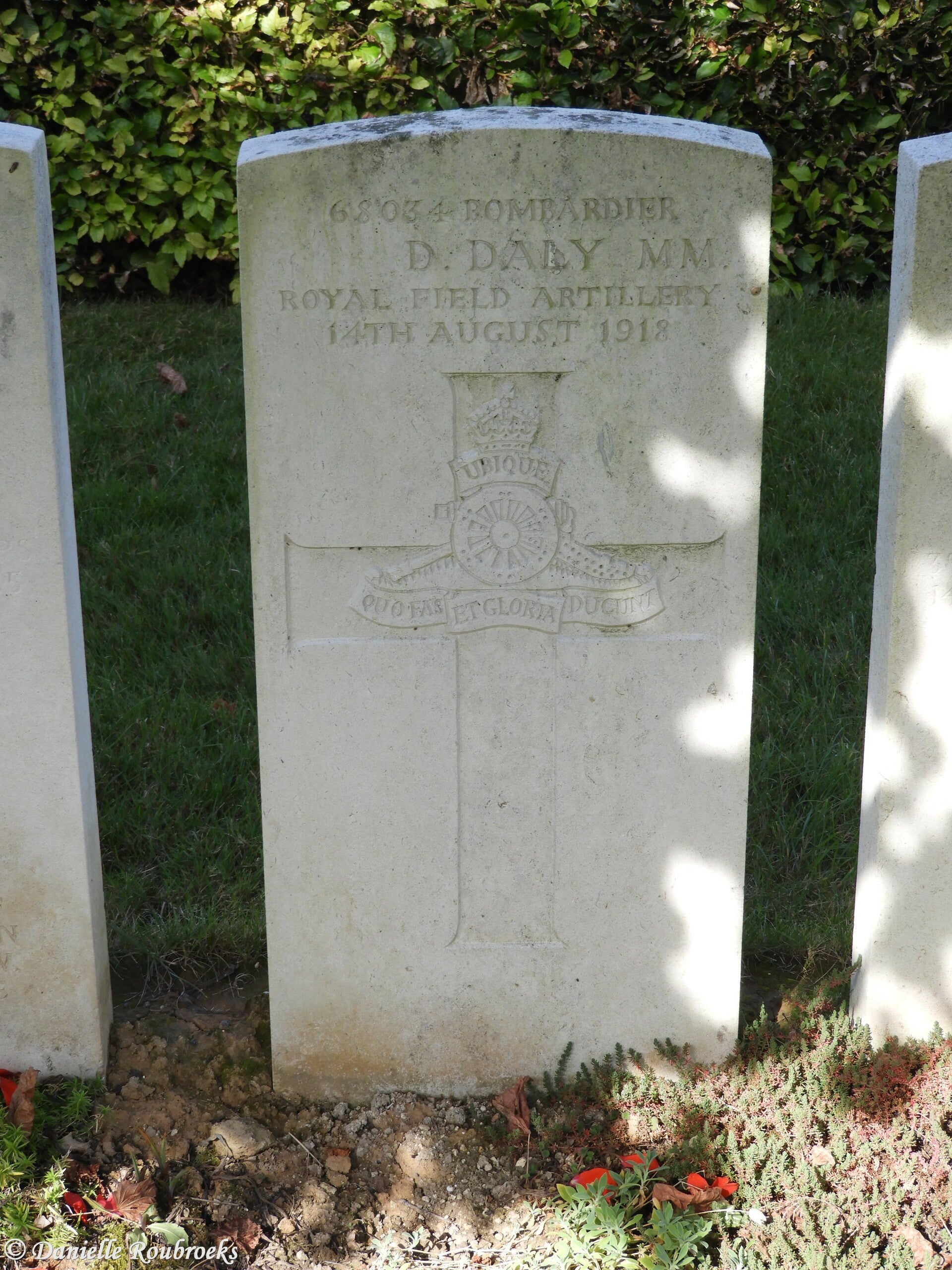 There are now 1,231 Commonwealth servicemen of the First World War buried or commemorated in Daours Communal Cemetery Extension. The total includes special memorials to four men of the Chinese labour corps whose graves in White Chateau Cemetery, Cachy, could not be located. The adjoining communal cemetery contains two First World War burials made before the extension was opened.