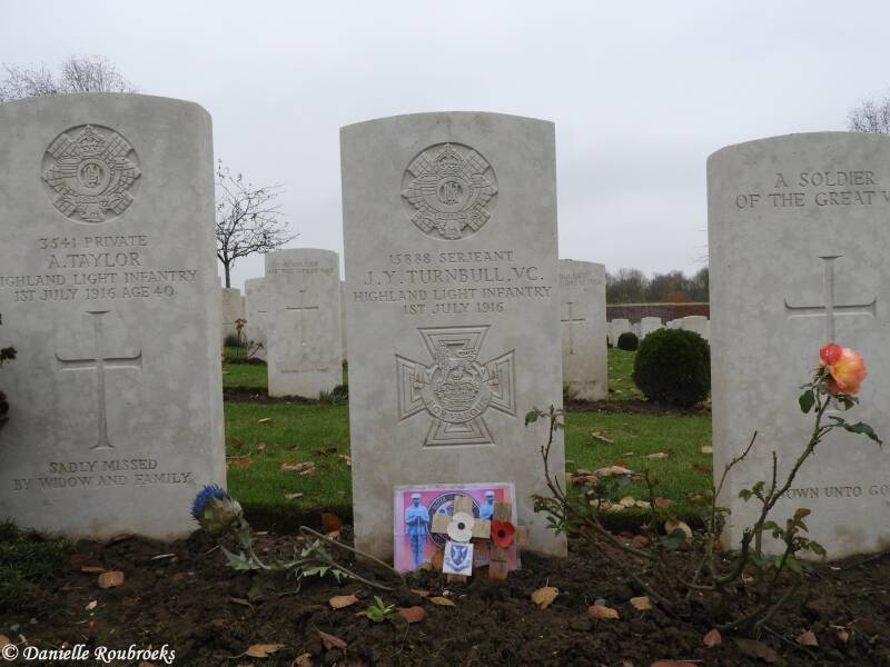 An extract from "The London Gazette," No. 29836, dated 24th Nov., 1916, records the following:-"For most conspicuous bravery and devotion to duty, when, having with his party captured a post apparently of great importance to the enemy, he was subjected to severe counter-attacks, which were continuous throughout the whole day. Although his party was wiped out and replaced several times during the day, Serjeant Turnbull never wavered in his determination to hold the post, the loss of which would have been very serious. Almost, single-handed, he maintained his position, and displayed the highest degree of valour and skill in the performance of his duties. Later in the day this very gallant soldier was killed whilst bombing a counter-attack from the parados of our trench."