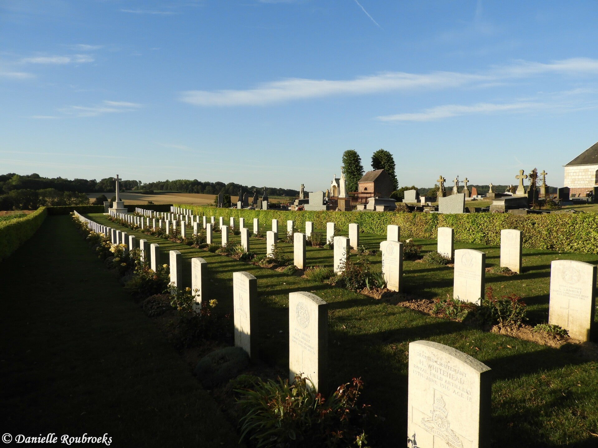 Mailly-Maillet was comparatively quiet until the German advance at the end of March 1918. It remained in Allied hands, but was severely shelled and the catacombs under the village were prepared for use by the troops. The extension was begun by French units (mainly Engineers) in June 1915. Commonwealth forces relieved the French here in August 1915, and field ambulances and fighting units continued to use the extension until December 1916, then again in March-July, 1918. The 51 French graves and those of two German prisoners have been removed to other cemeteries.