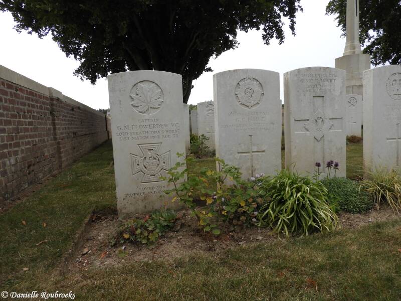 An extract from the Second Supplement to the London Gazette, No. 30648, of 24th April, 1918, records the following: "For most conspicuous bravery and dash when in command of a squadron detailed for special service of a very important nature. On reaching the first objective, Lt. Flowerdew saw two lines of the enemy, each about sixty strong, with machine guns in the centre and flanks, one line being about two hundred yards behind the other. Realising the critical nature of the operation and how much depended upon it, Lt. Flowerdew ordered a troop under Lt. Harvey, V.C. to dismount and carry out a special movement while he led the remaining three troops to the charge. The squadron (less one troop) passed over both lines, killing many of the enemy with the sword; and wheeling about galloped at them again. Although the squadron had then lost about 70 per cent of its numbers, killed and wounded, from rifle and machine gun fire directed on it from the front and both flanks, the enemy broke and retired. The survivors of the squadron then established themselves in a position where they were joined, after much hand-to-hand fighting, by Lt. Harvey's party. Lt. Flowerdew was dangerously wounded through both thighs during the operation, but continued to cheer on his men. There can be no doubt that this officer's great valour was the prime factor in the capture of the position."